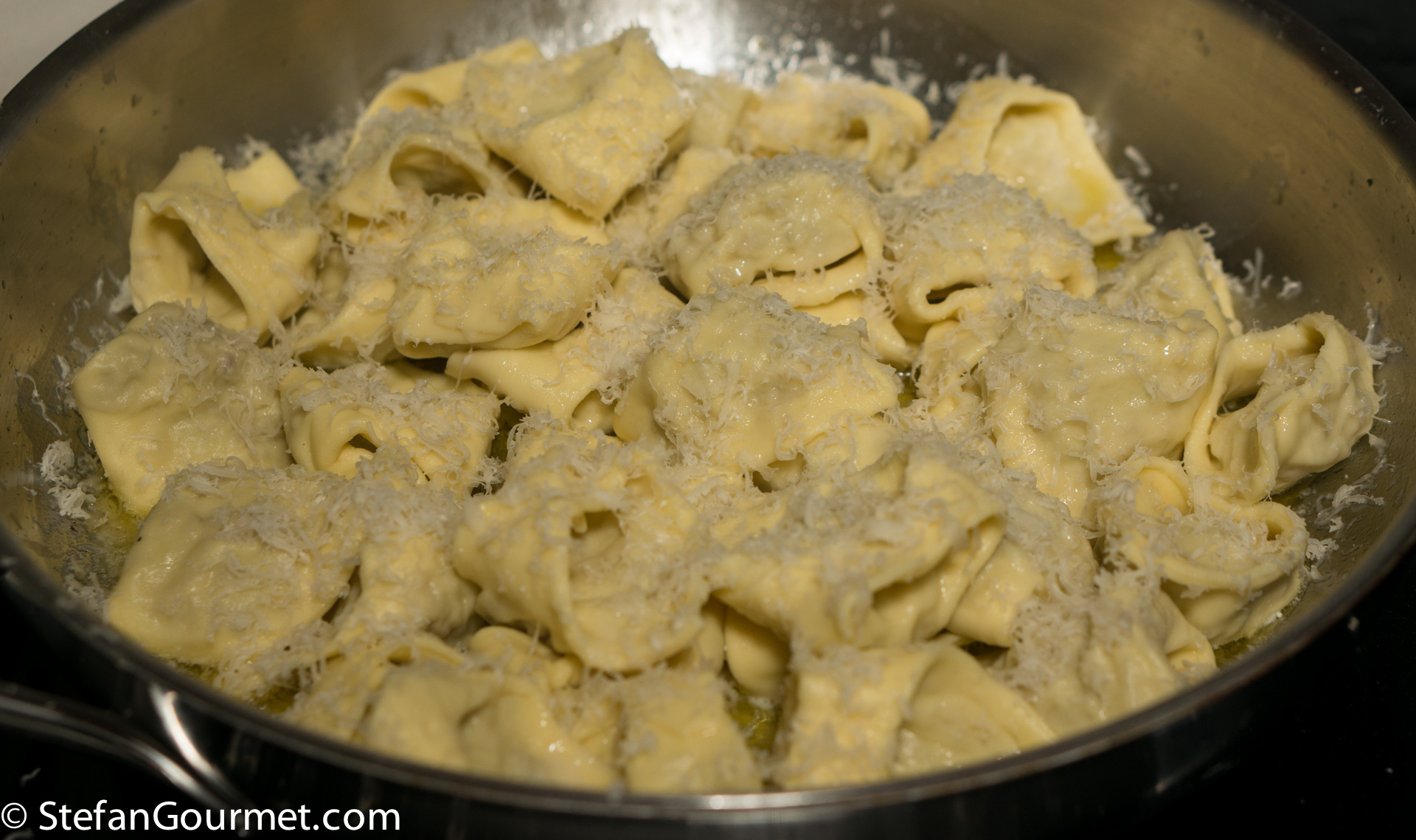 Sprinkle with freshly grated parmigiano once you have lifted all of the tortelli out of the pot.