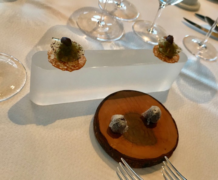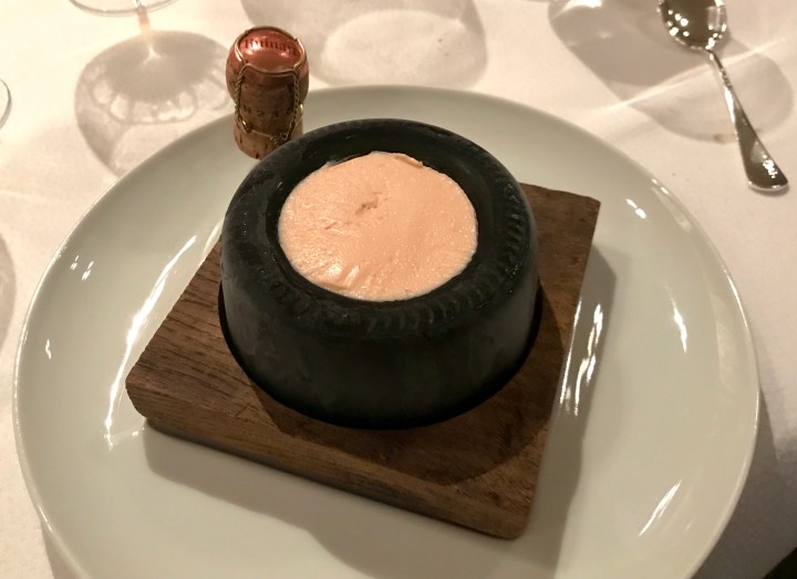 The signature palate cleanser: ruinart rosé champagne cream sorbet, served in the punt of an actual bottle of that same champagne. (The “punt” is the dimple at the bottom of a wine bottle.)