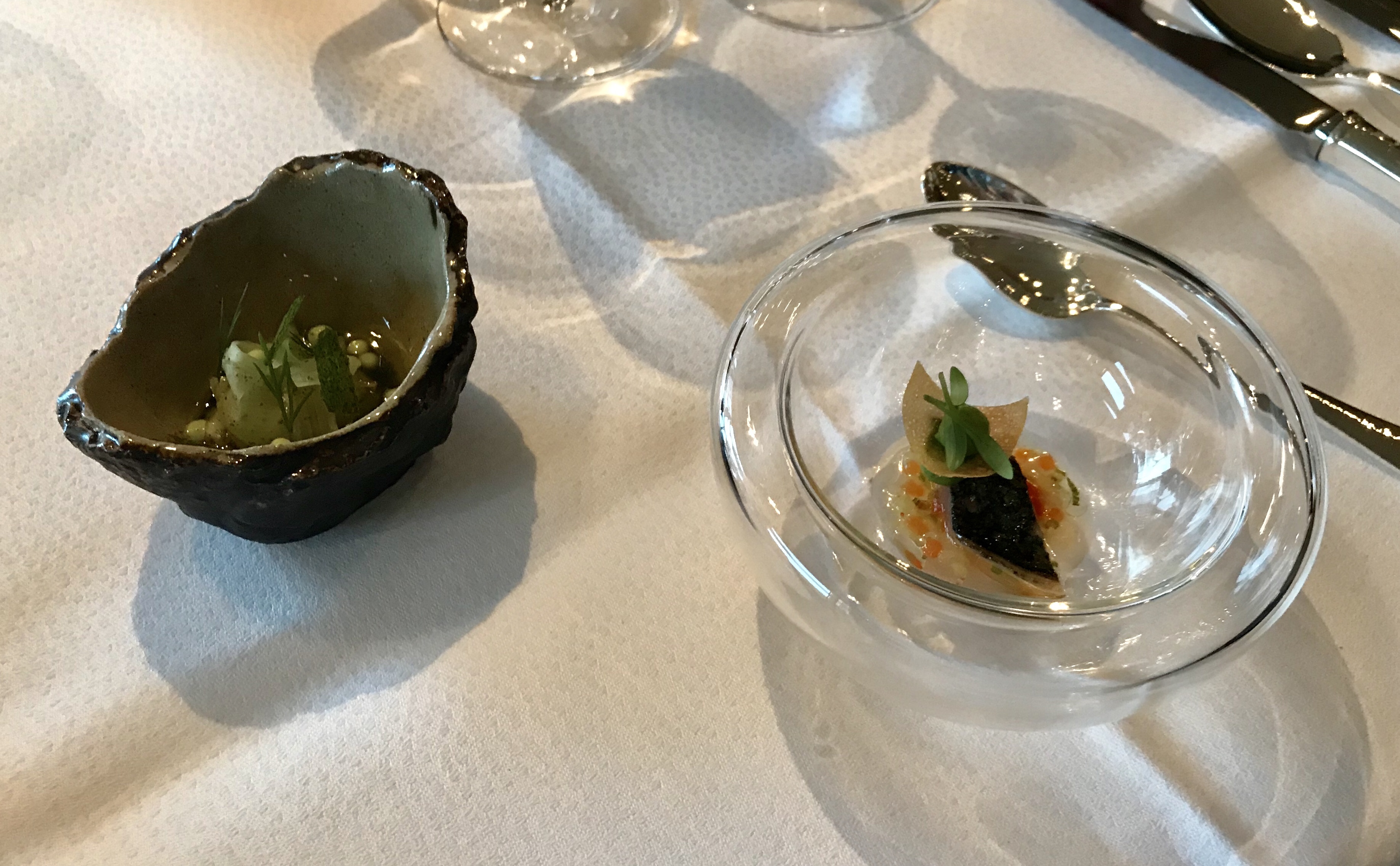 Aqua is the restaurant of chef Sven Elverfeld and host and sommelier Marcel Runge that is located in the Ritz-Carlton hotel in Wolfsburg, about an hour West of Berlin in Germany. Michelin’s definition of a three star restaurant states that it is worth the journey just to eat there. Some restaurants are located in areas that are worth traveling to anyway, but unless you really like Volkswagen cars then Wolfsburg is not really such a destination. But we did travel to Wolfsburg just to eat at Aqua again, based on our great experience there four years ago. We were very curious if it was still as good as we remembered it to be. They still have great package deals that include a meal with accompanying wines and a club room at the Ritz-Carlton. We opted for the nine course Inspiration menu (255 euros) with accompanying wines (175 euros).