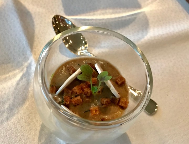 Last but certainly not least of the greeting was a soft boiled quail egg with raw mushrooms, crispy croutons, and braised calf’s tongue. All the greetings from the kitchen had great complexity and balance. 10/10