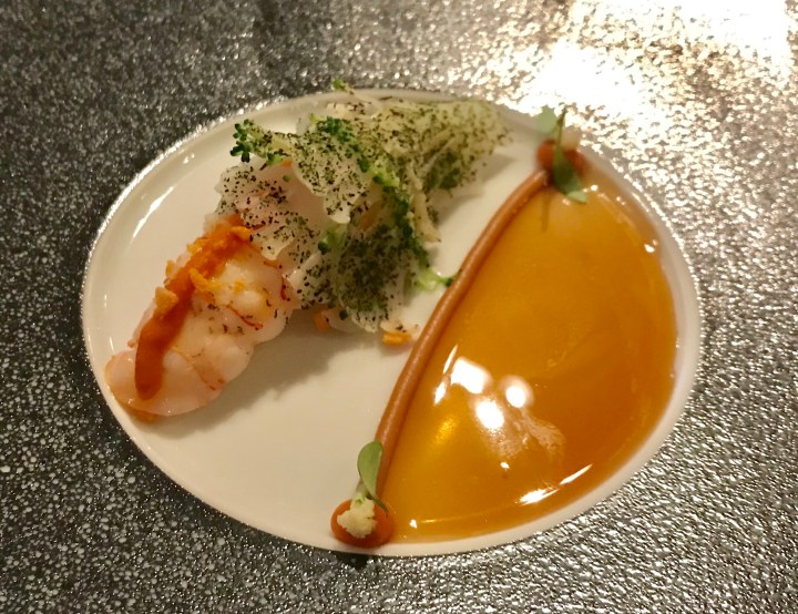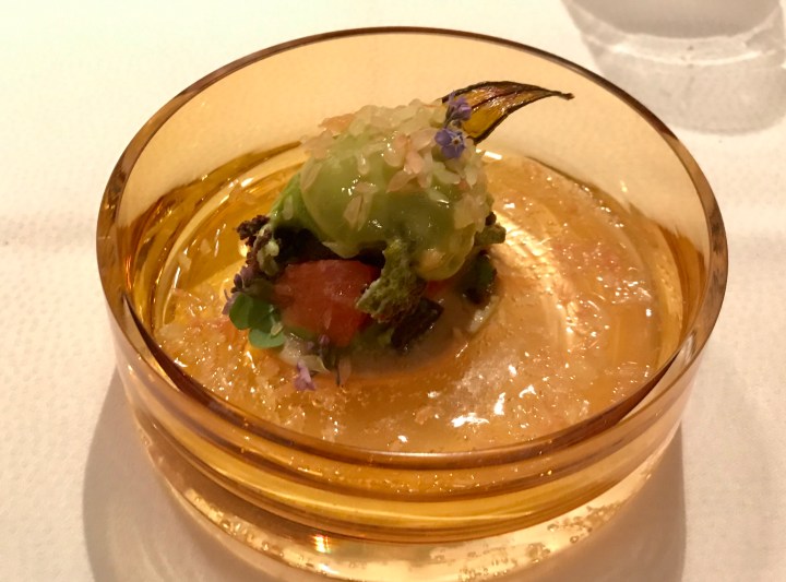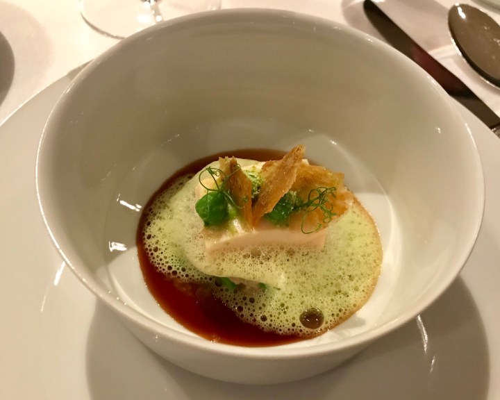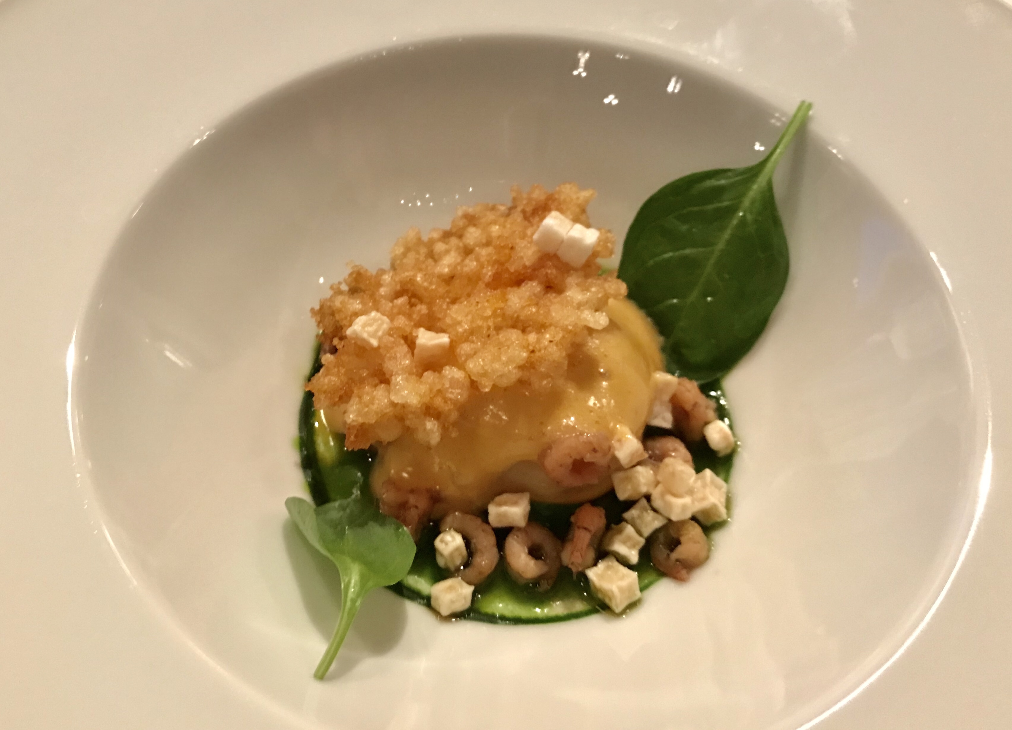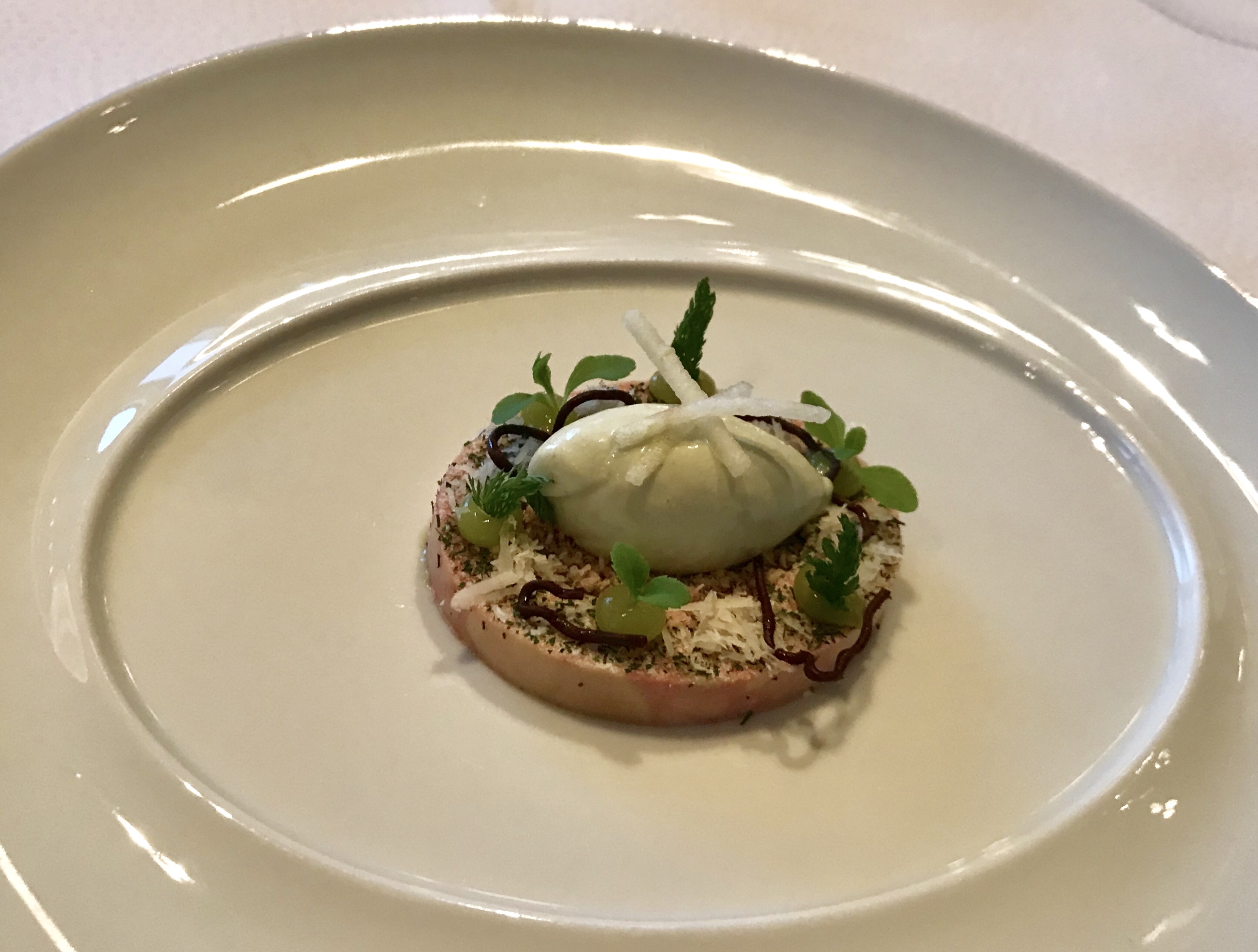 An egg yolk cooked sous-vide at 65C/149F with the texture of custard with grey shrimp, spinach, piment d’Espelette and a crisp with shrimp flavor that reminded me of krupuk. Yet another contrast of flavors and textures: fresh green, crunchy crisp, unctuous egg, and the deep flavor of the tiny shrimp. This was paired with a great Chardonnay from California in a modern style that was more “ripe” than Chardonnay from Burgundy but otherwise very elegant and balanced. It worked very well with the dish. 10/10