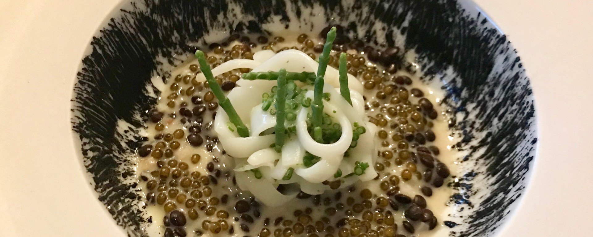 Cuttlefish (squid) cut into the shape of tagliatelle and cooked in a stock of smoked sturgeon with Beluga lentils, imperial caviar, sauce of smoked sturgeon and samphire. The combination of flavors and textures in this dish was just wonderful. The crispy samphire, the creamy sturgeon, the chewy lentils, the tender cuttlefish, it all worked together and was paired with a white wine from Tenerife. The wine is made in an oxidative style from local grape varieties and by itself seemed nothing special, but with the dish it really came to life and was a perfect pairing. 10/10
