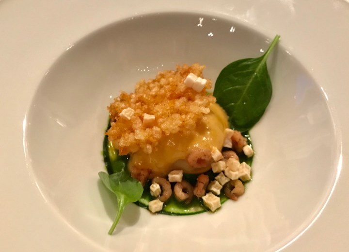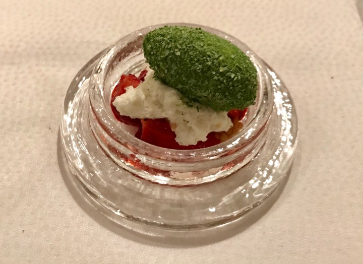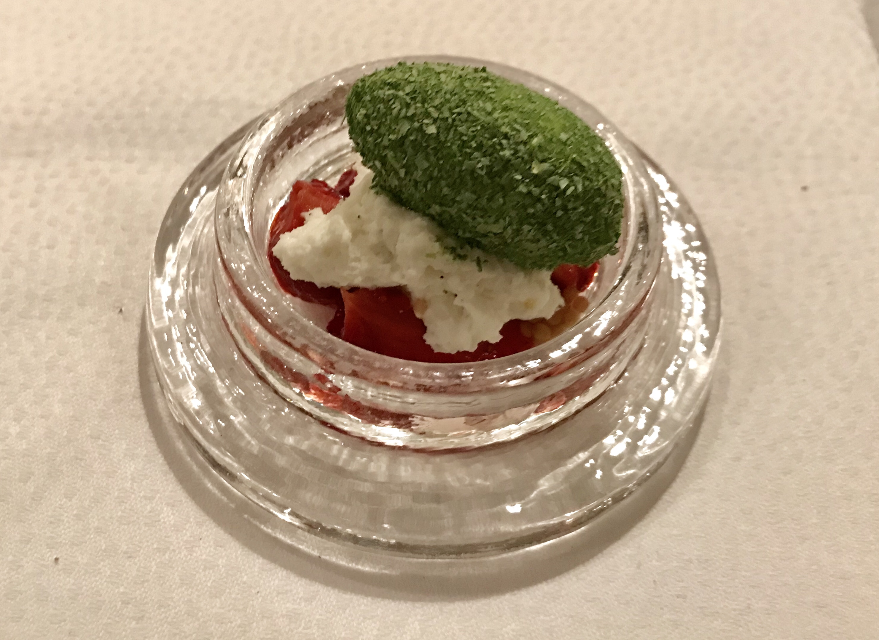 The greetings from the kitchen are accompanied by a glass of rosé champagne. The caramelized kalamata olives have a nice contrast between the salty olive and the crispy sweet coating. The spicy chicken skin with avocado and green olive is a complex and delicious mix of flavors and textures.