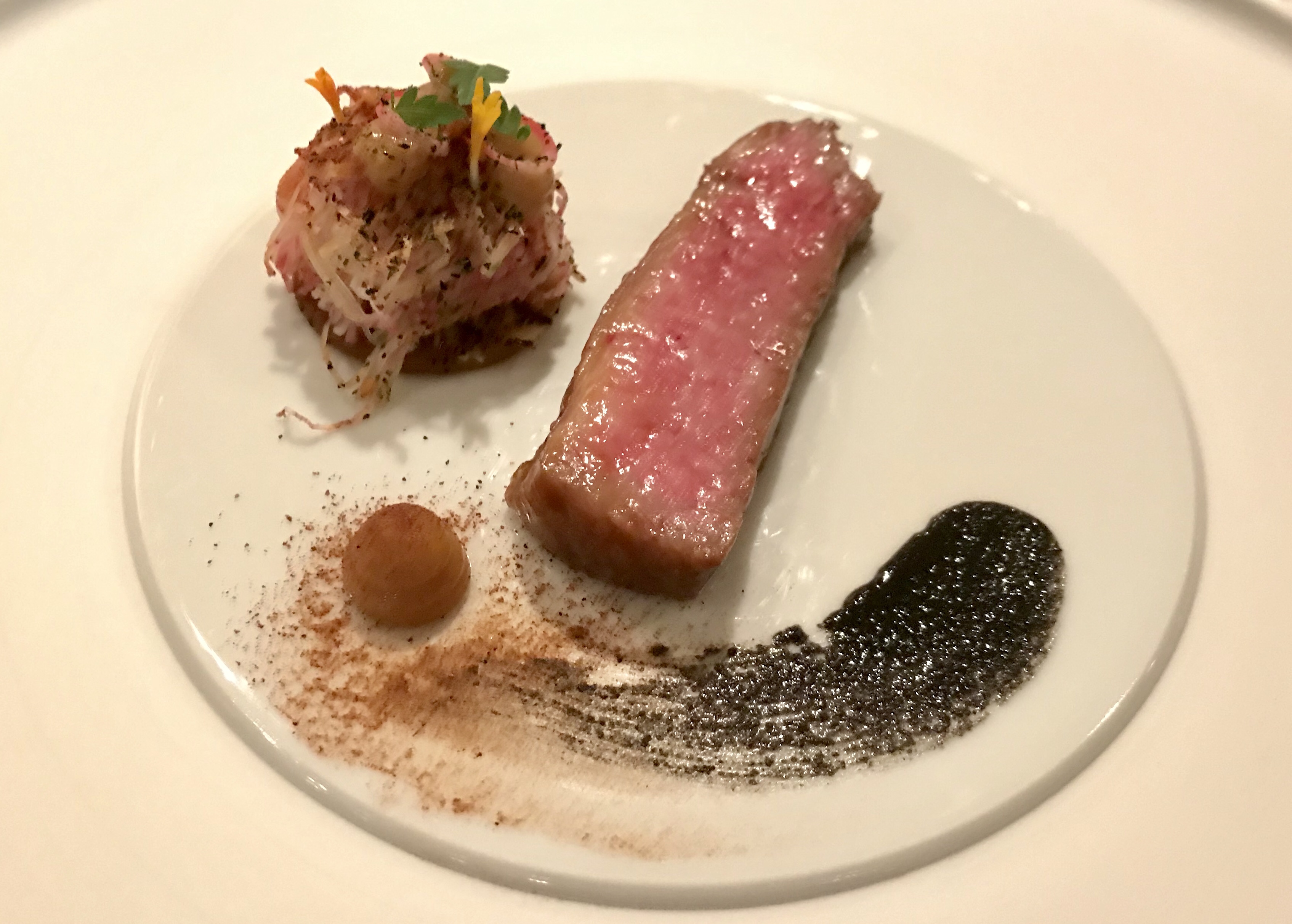 The combination of lobster and cauliflower may sound unusual, but together with the bisque (called “crustacean-essence” on the menu) it was a wonderful combination. The cauliflower was thinly shaved and sprinkled with a tiny bit of broccoli. The wine was unusual as well: from Bairrada in Portugal, a white wine made from the local blue skinned Baga grape variety. Another wine in an oxidative style that became so much better with the dish. 10/10