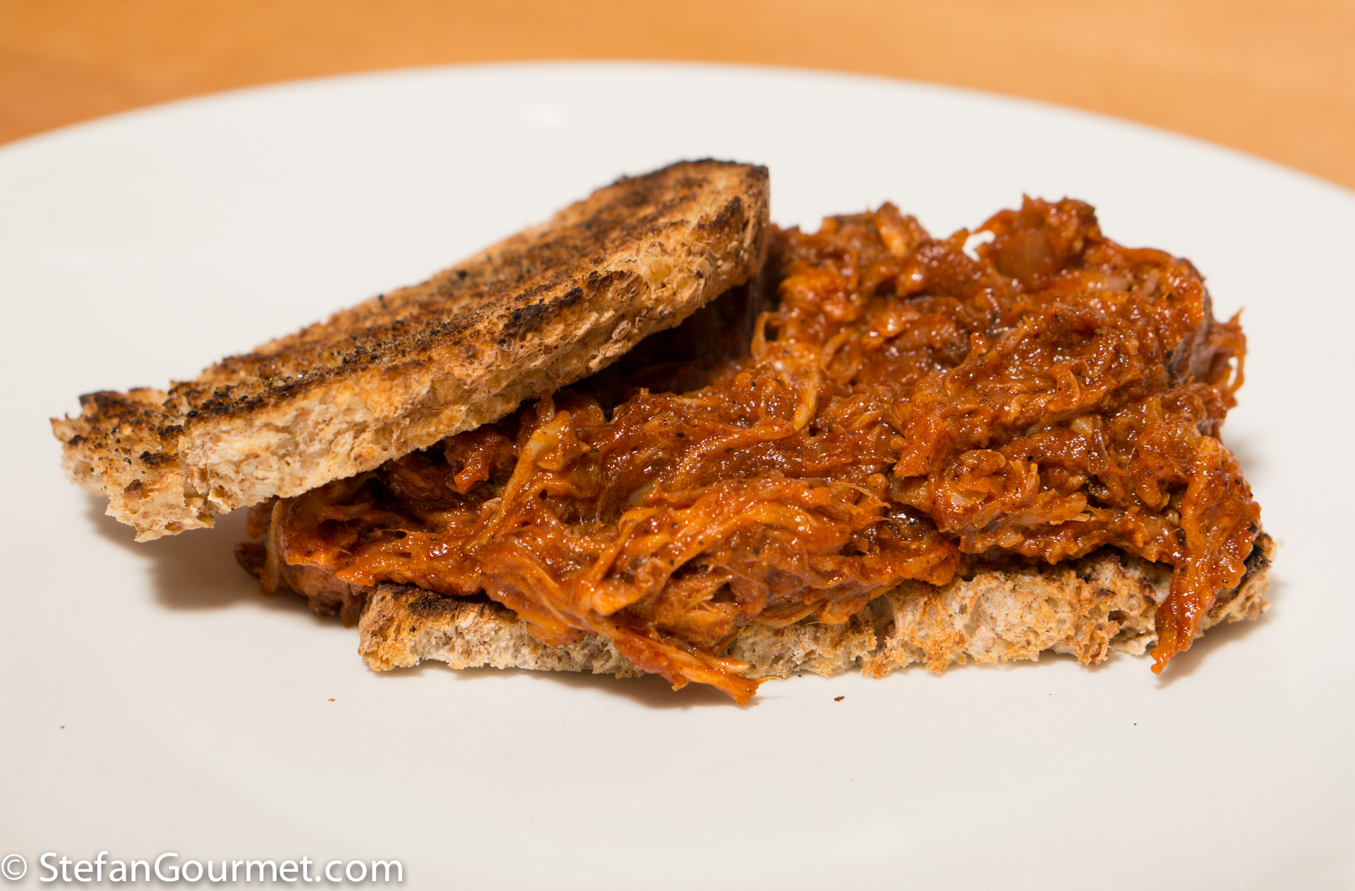A very appropriate flashback today: pulled pork sous-vide. This is also made of pork neck, but cooked for 24 hours at 74C/165F after it has been smoked. In this case the flavor of the seasoning and smoking is mixed through the meat after pulling it.