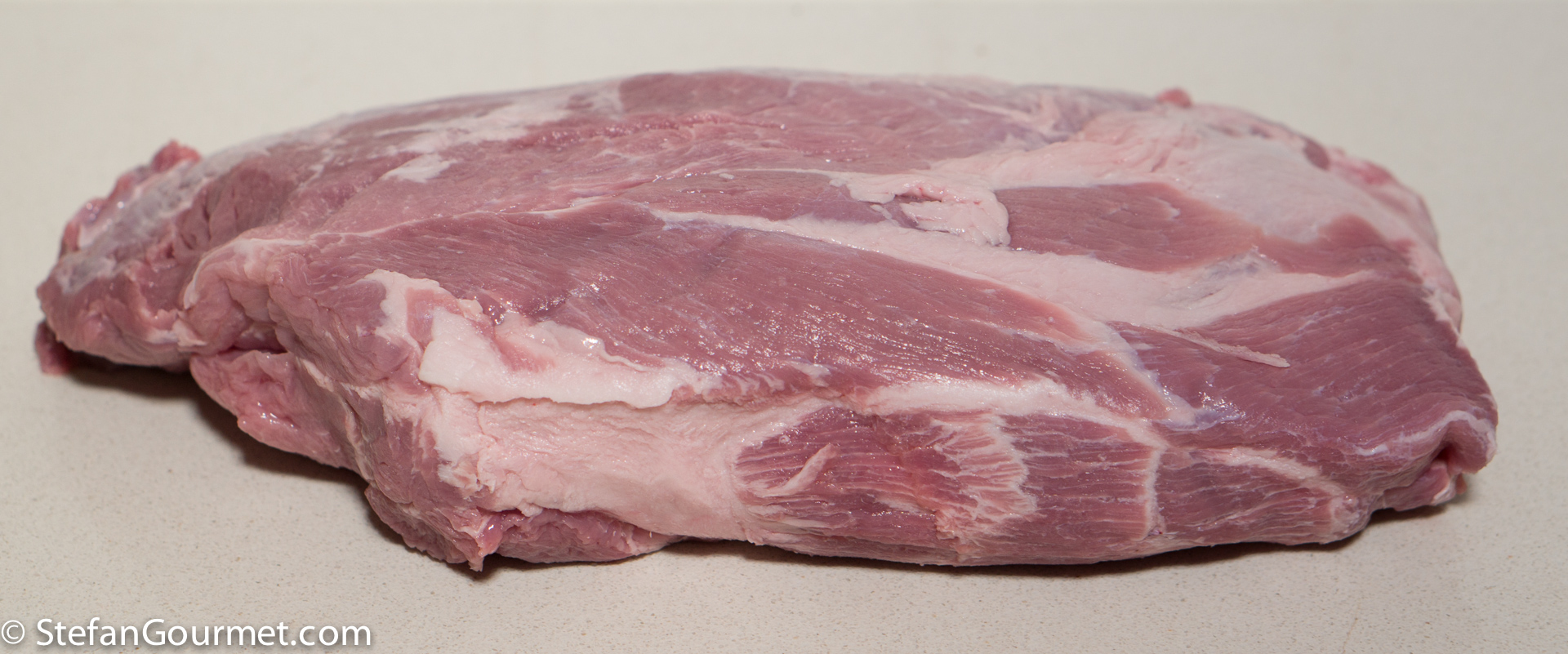 I started out with this nice slab of pork neck (part of a cut that is called pork shoulder in many regions), and cut it into six pieces of roughly equal size.