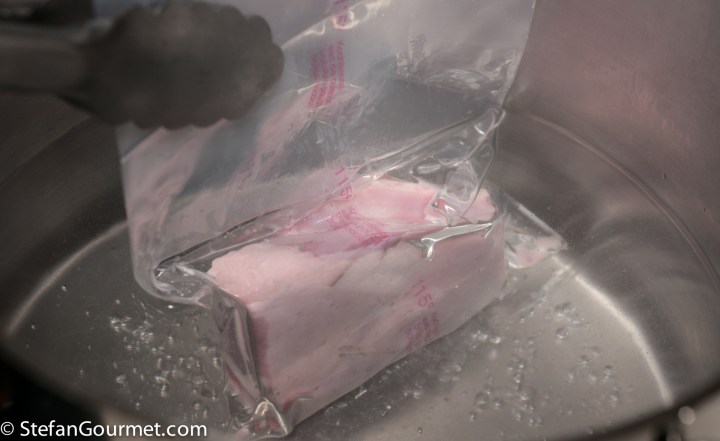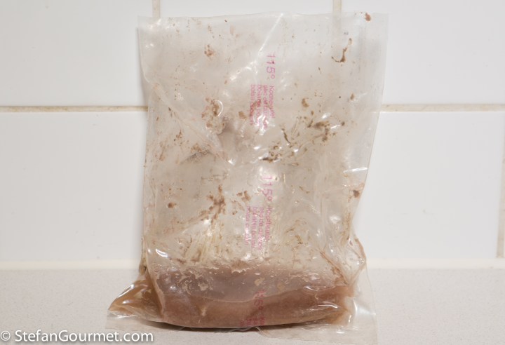 Since the long cooking at a temperature below 60C/140F can lead to the development of a bad smell, I scalded each of the bags in hot water after vacuum sealing to prevent that. Read more about why this is necessary here.