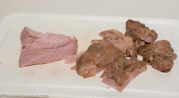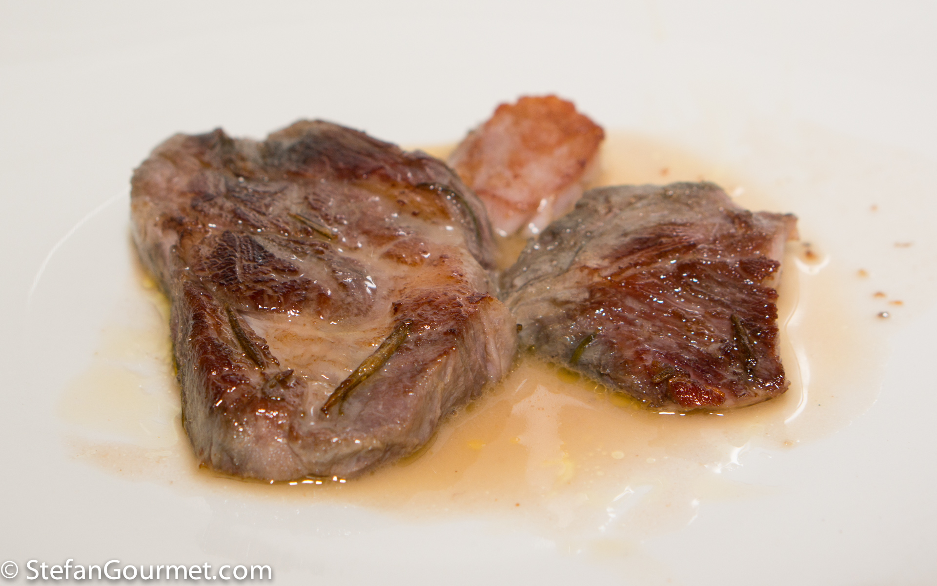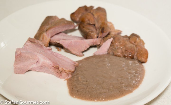 Although we could not detect any tomato flavor on the inside (and also from the color you can see that the tomato did not get far into the meat), we did have the impression that something had happened to the texture of the meat. Perhaps it is the acidity of the tomatoes? It is difficult to tell as pork neck is not a uniform cut of meat, so the difference we noticed could just have been caused by the particular part.