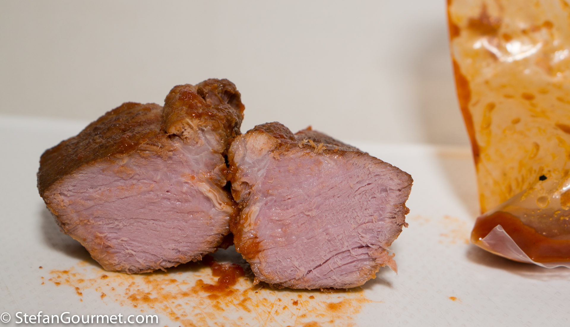 It is not a surprise after the previous results that none of the browned flavors had ended up on the inside of the meat, but raw meat somehow browns more easily than meat that is already cooked sous-vide and the browned flavor of the crust is really good. Of course any crispness is lost by the step of sous-vide cooking, but this could be counteracted by briefly post-searing the pre-seared pork as well. Unfortunately I did not do a side by side comparison with pork that was only post-seared to determine the difference in flavor. (I am doing this for fun and all the pork you see in this post ended up as our dinner on different evenings. There is only so much pork you can eat in one sitting.)
