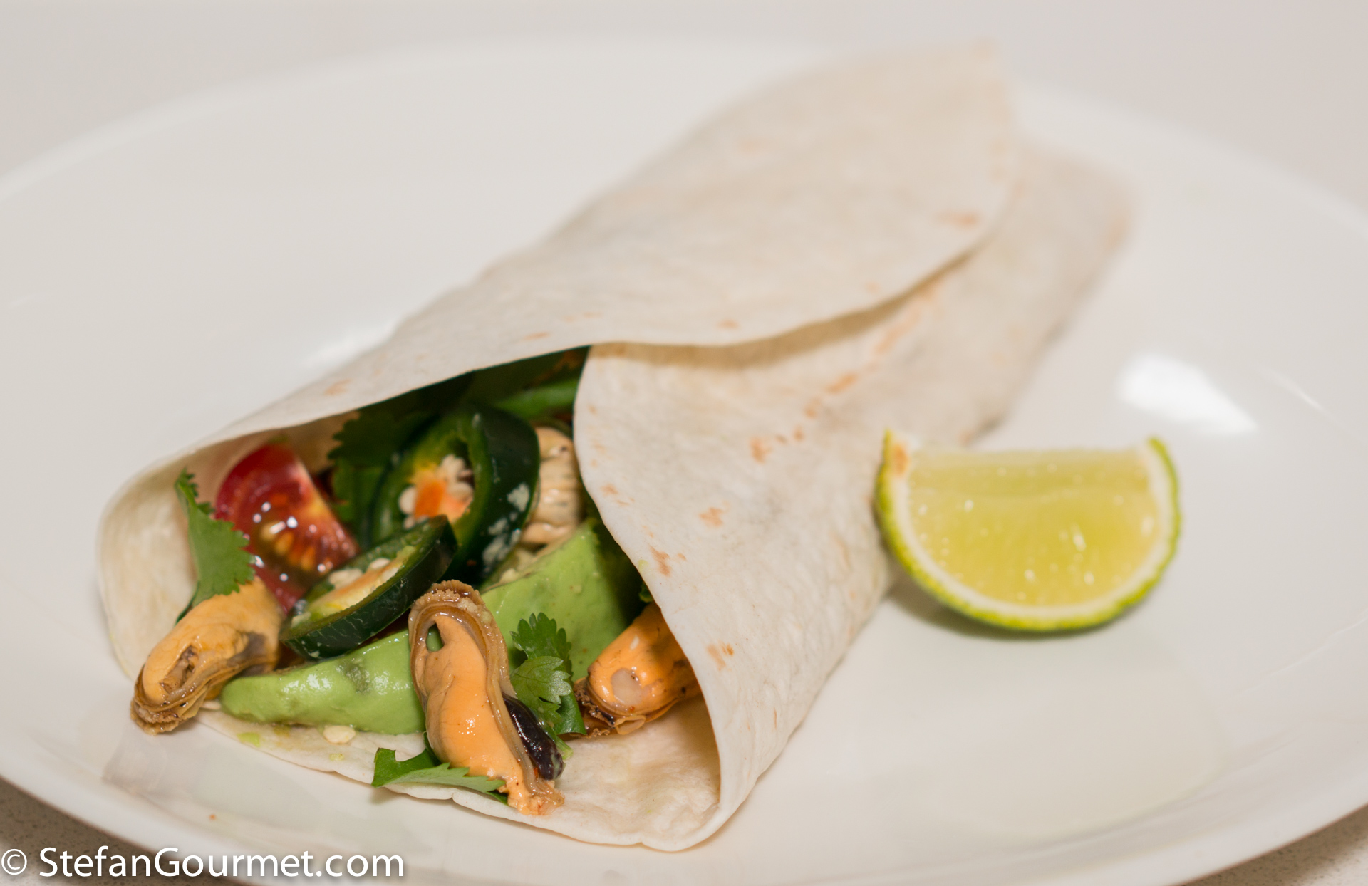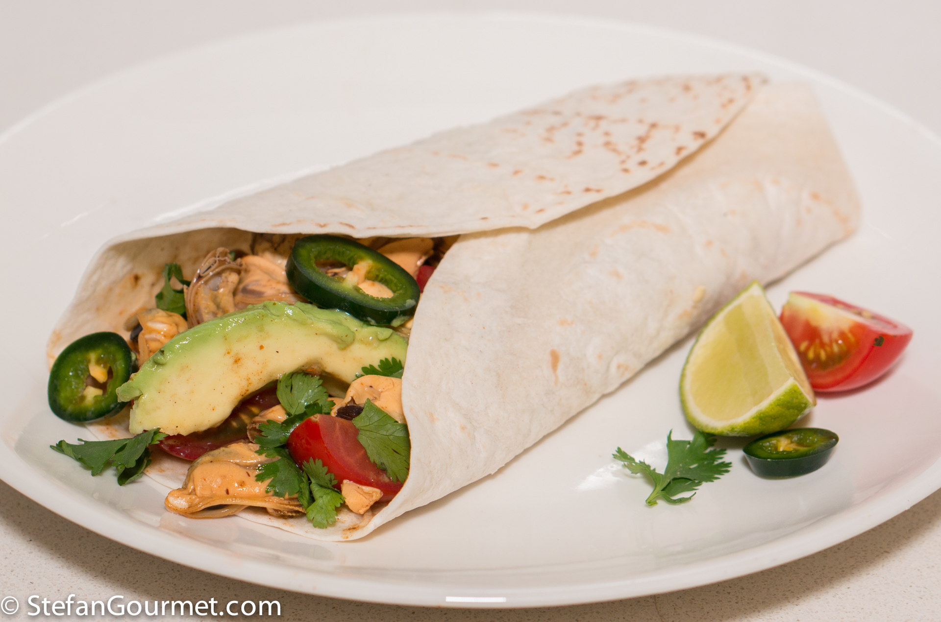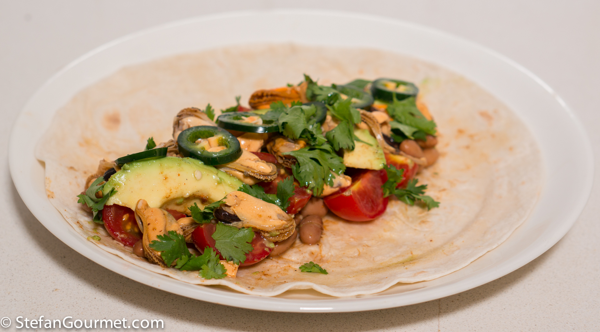 I had some leftover mussels and leftover wheat tortillas, and decided to make some mussel tacos or burritos. The main difference between a taco and burrito is the size: a taco is a snack, whereas a burrito is a full meal. The wheat tortillas I had were quite large (about 30 cm/12″), so this should probably be called a burrito, but if you use smaller tortillas you can use the same recipe to make tacos. I tried them with and without beans, and liked them better without as the mussels can be tasted better that way.