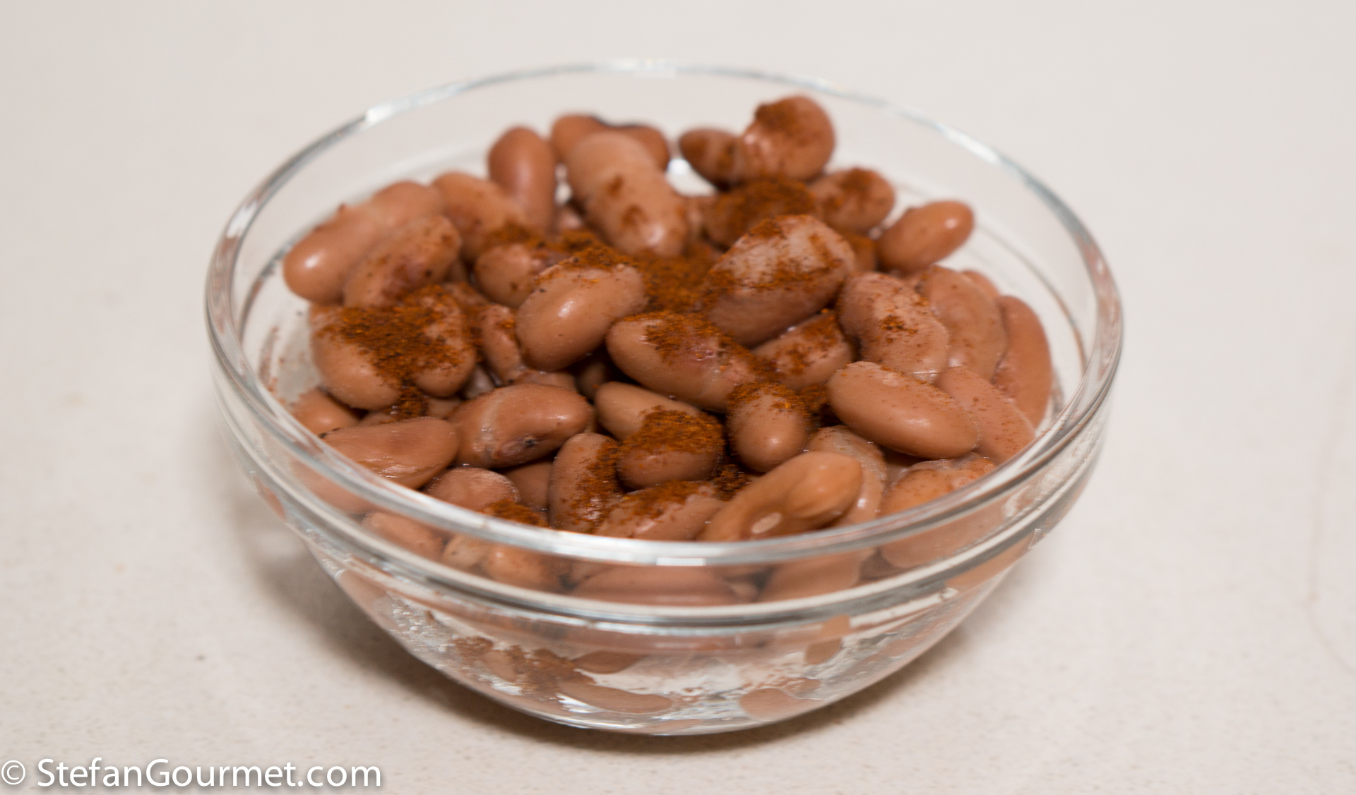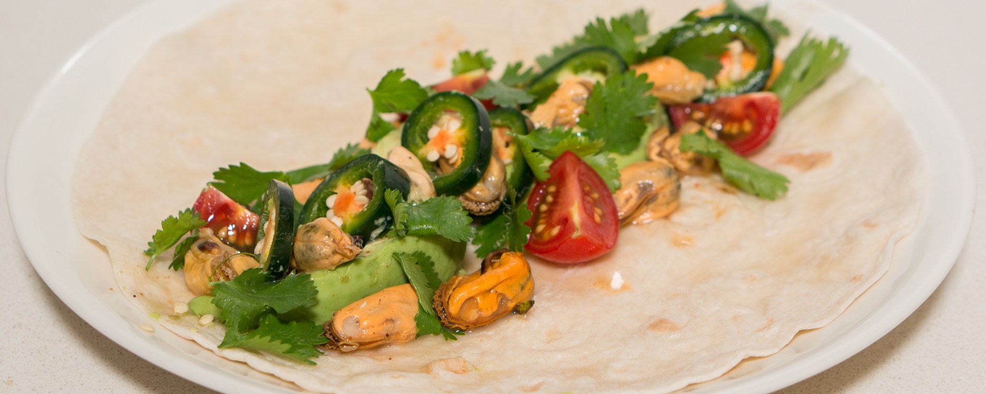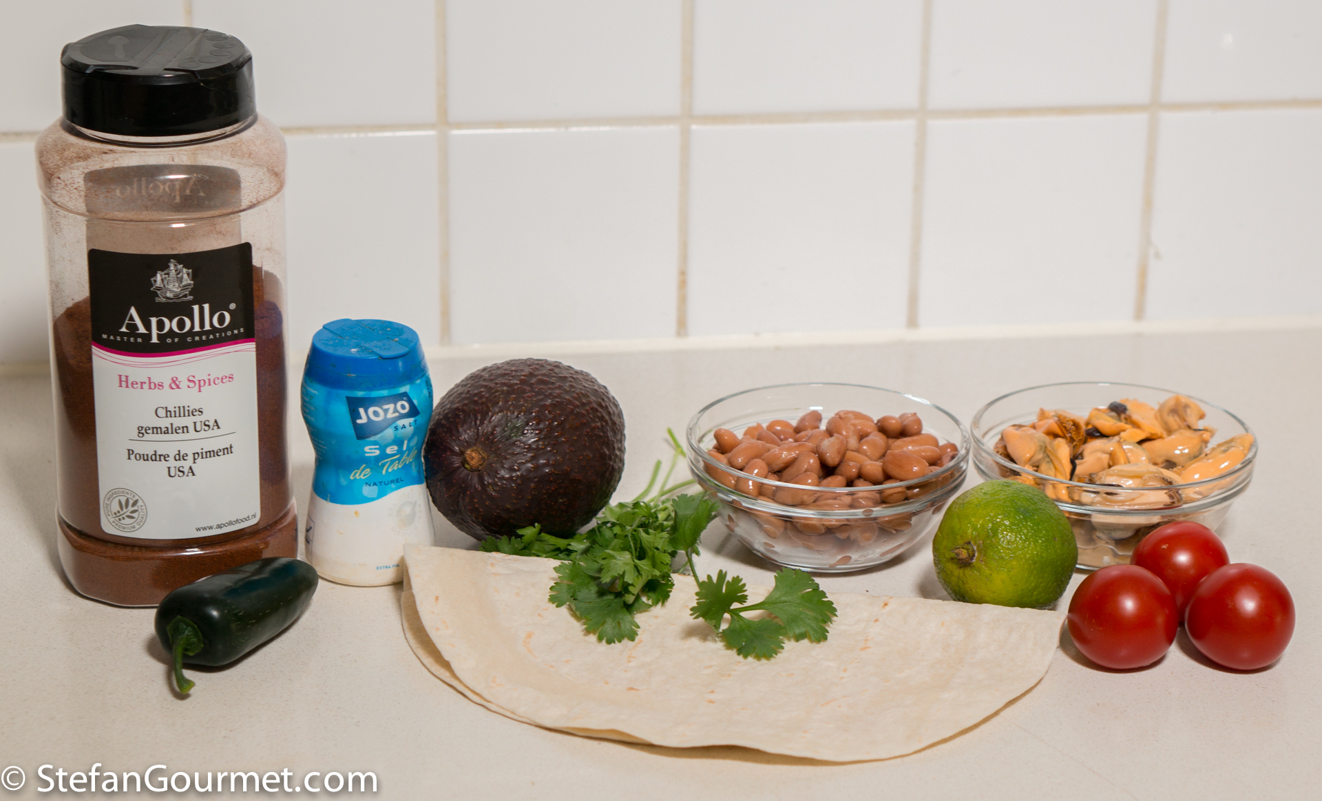 I had some leftover mussels and leftover wheat tortillas, and decided to make some mussel tacos or burritos. The main difference between a taco and burrito is the size: a taco is a snack, whereas a burrito is a full meal. The wheat tortillas I had were quite large (about 30 cm/12″), so this should probably be called a burrito, but if you use smaller tortillas you can use the same recipe to make tacos. I tried them with and without beans, and liked them better without as the mussels can be tasted better that way.