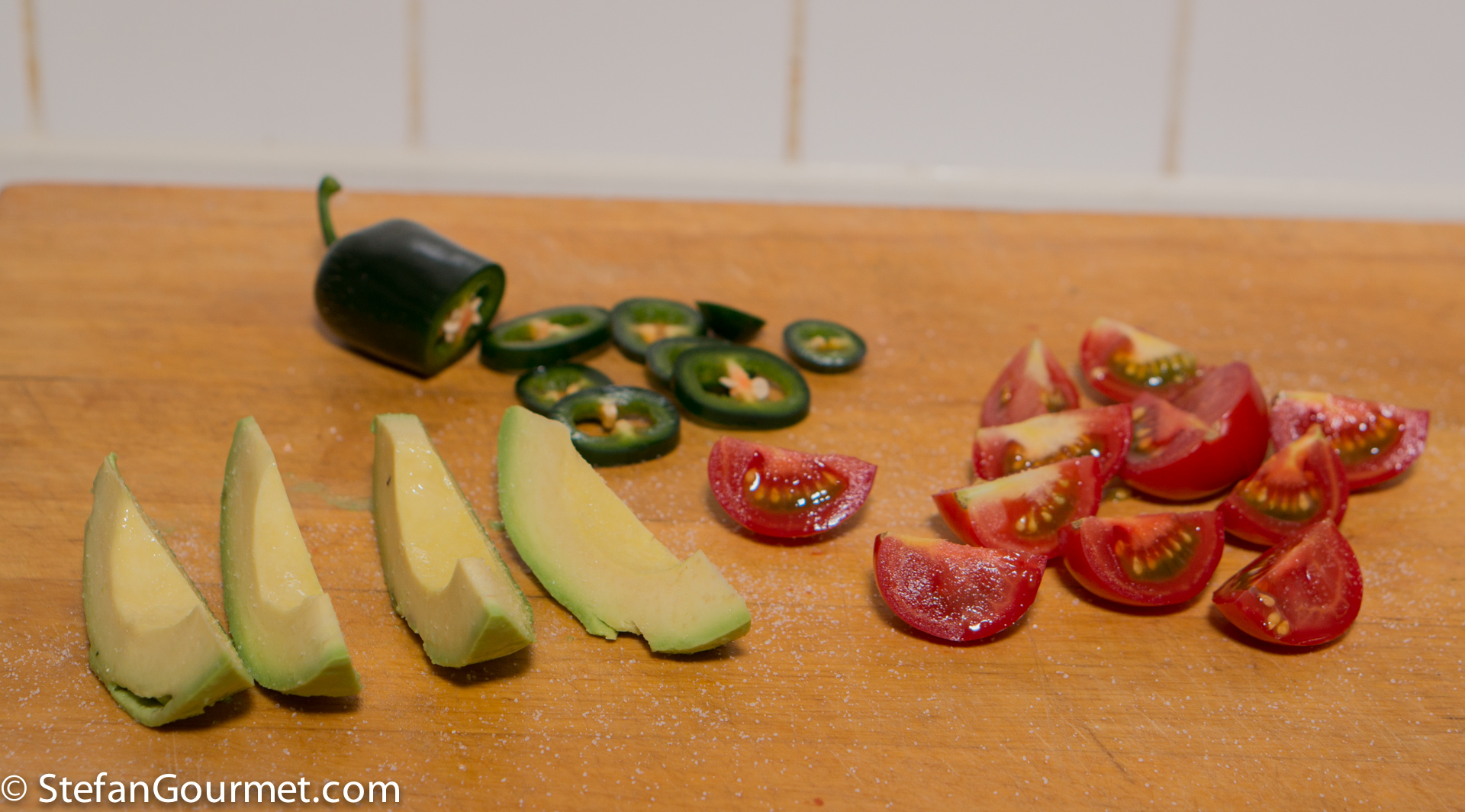Sprinkle avocado slices with lime juice to prevent discoloring. Season tomatoes and avocado with salt.