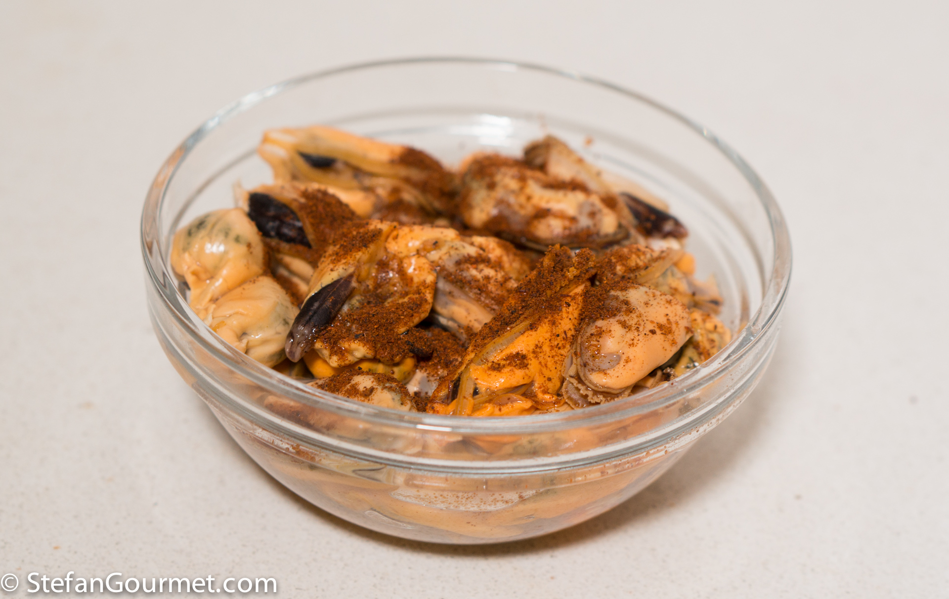 Season the mussels with chilli powder. I used 1/4 teaspoon for 125 grams (1/2 cup) of cooked mussel meat.