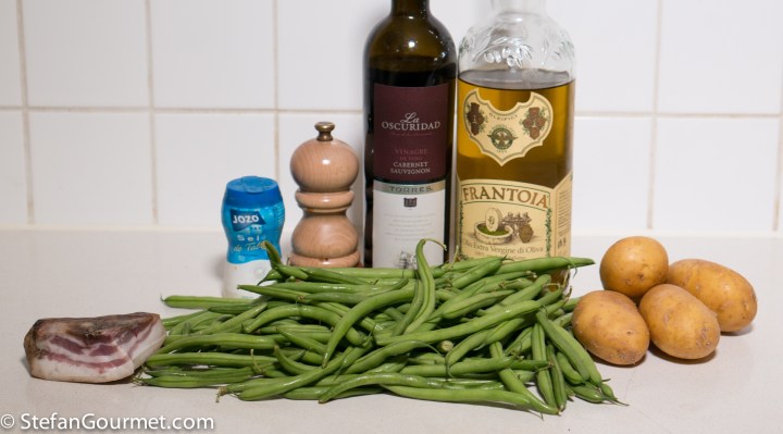 Another recipe with green beans. I haven’t posted a Biba Caggiano recipe in a while; she’s my favorite Italian cookbook author from the time before I could read Italian cookbooks myself. This is perfect for the summer and excellent to bring to a picnic or potluck — just bring the dressing separately in a jar with a lid, so you can shake it to emulsify it before serving.
