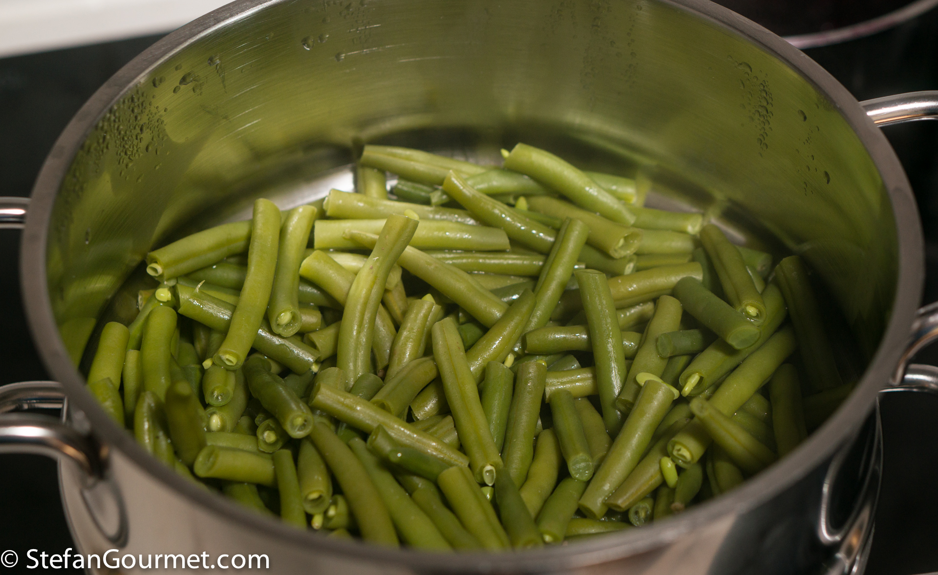 Trim the ends off the green beans, and cut them in half. Steam them until they are tender but still firm to the bite. The time will depend on their thickness, 5 to 10 minutes.