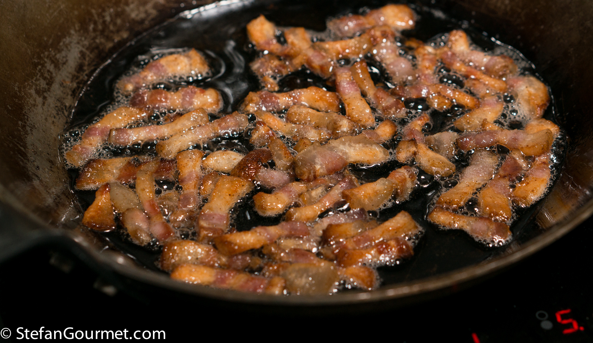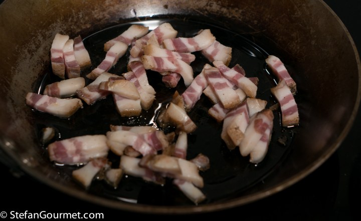 100 grams (3.5 oz) pancetta, in thick narrow strips (what the French call lardons) or diced