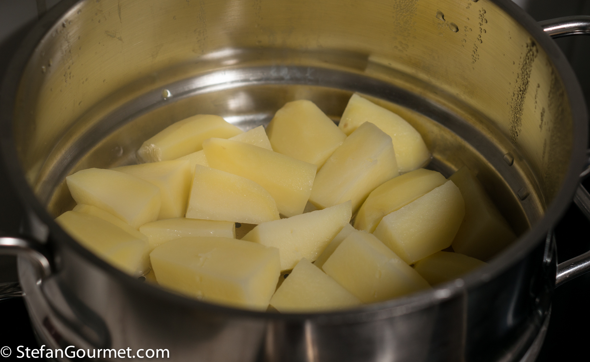 Peel the potatoes and cut into bite size chunks. Steam the potatoes until they are tender, about 15 minutes.