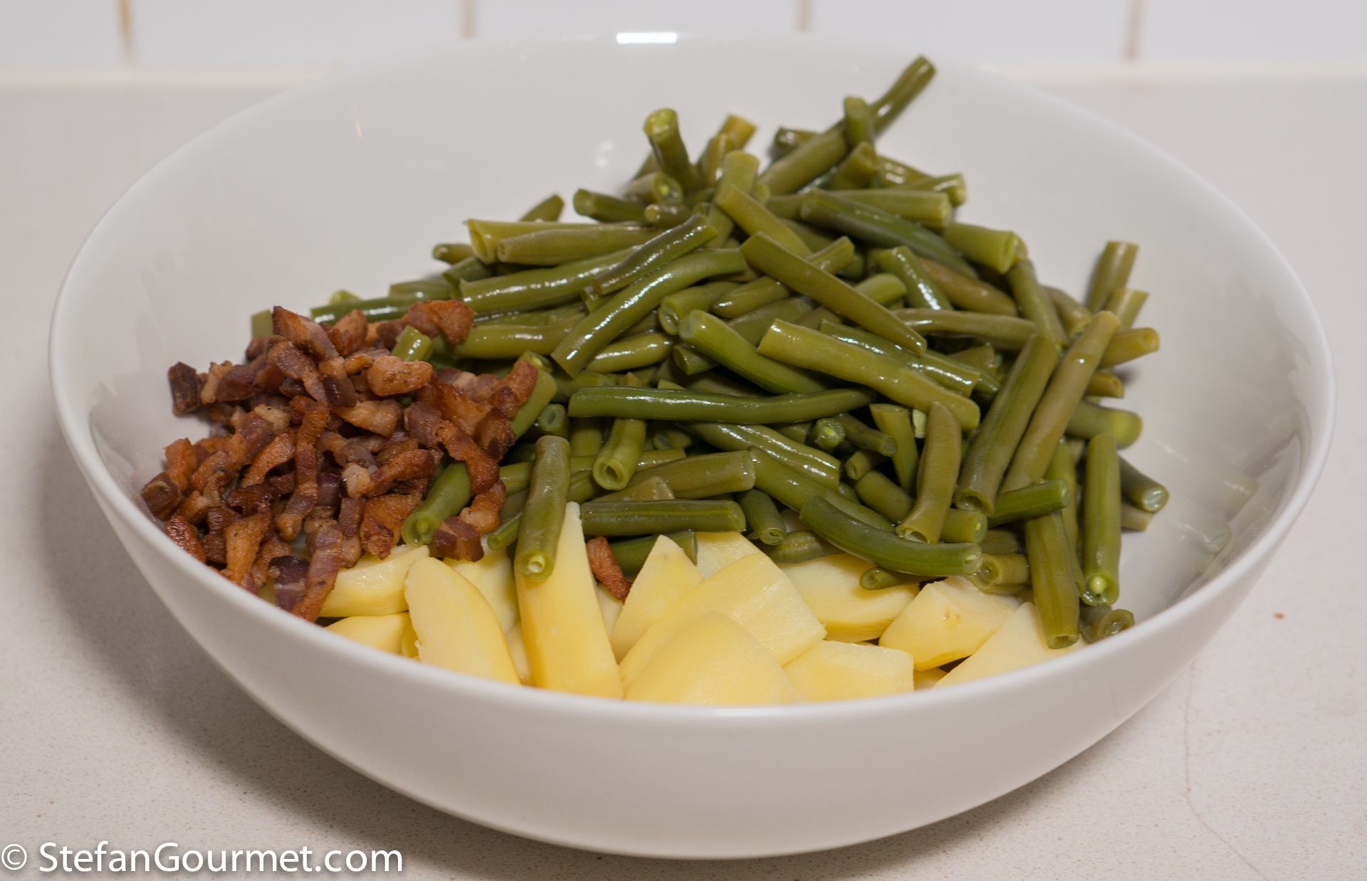 Combine the green beans, potatoes, and pancetta in a large bowl.
