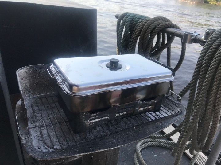 When it’s not raining I use the table top smoker outside, or like I did here on our boat. Indoors I have a very powerful kitchen vent that will get rid of the smoke before it can move into the house. I have noticed that most kitchen vents are pretty useless.
