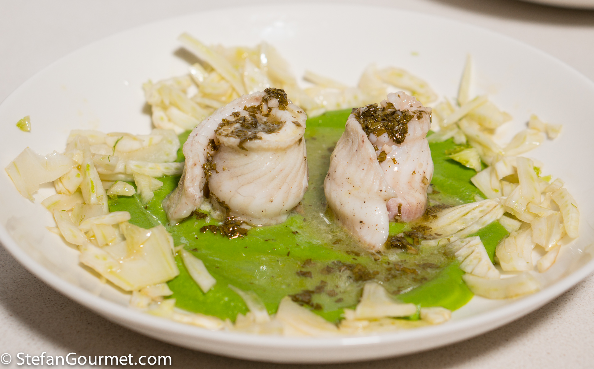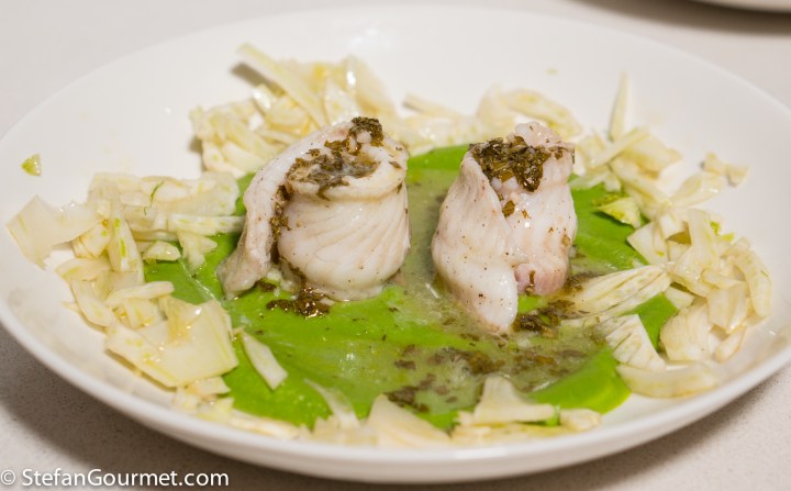 Sole with mint, peas, and fennel is an elegant dish for a dinner party that is easy to prepare. Flatfish with mint sauce is a combination I saw in one of Biba Caggiano’s cookbooks. In this case I used sole. If turbot is the king of flatfish, then sole certainly is the queen. But you could also use turbot or even flounder. Mint works well with peas, and the fennel salad adds a nice crispy element. This is one of those dishes where each bite should include a little bit of everything on the plate for the best experience.