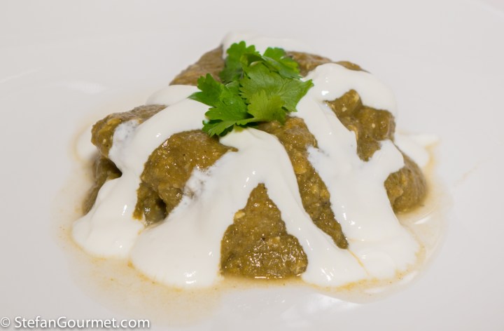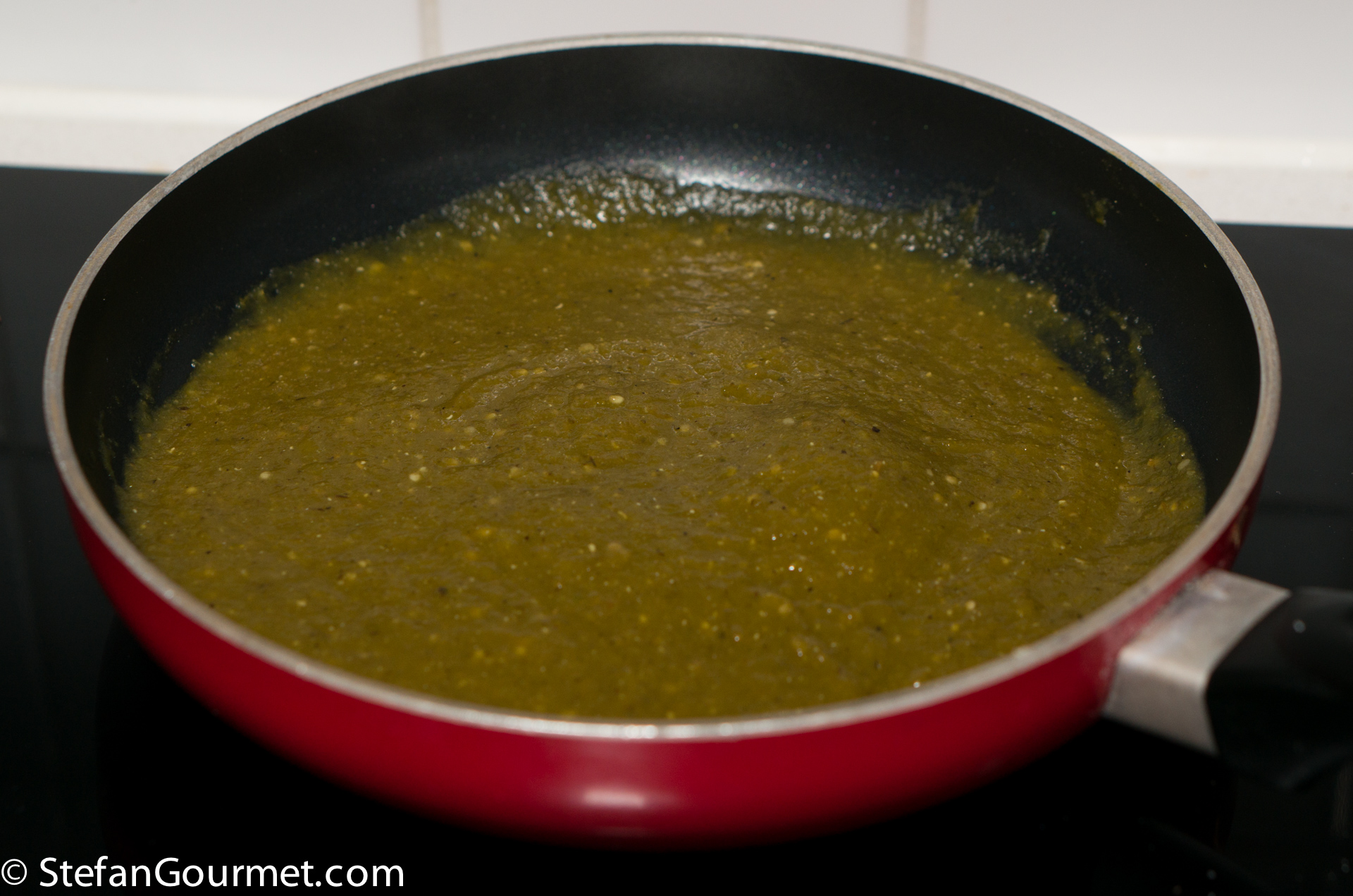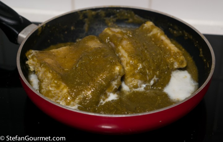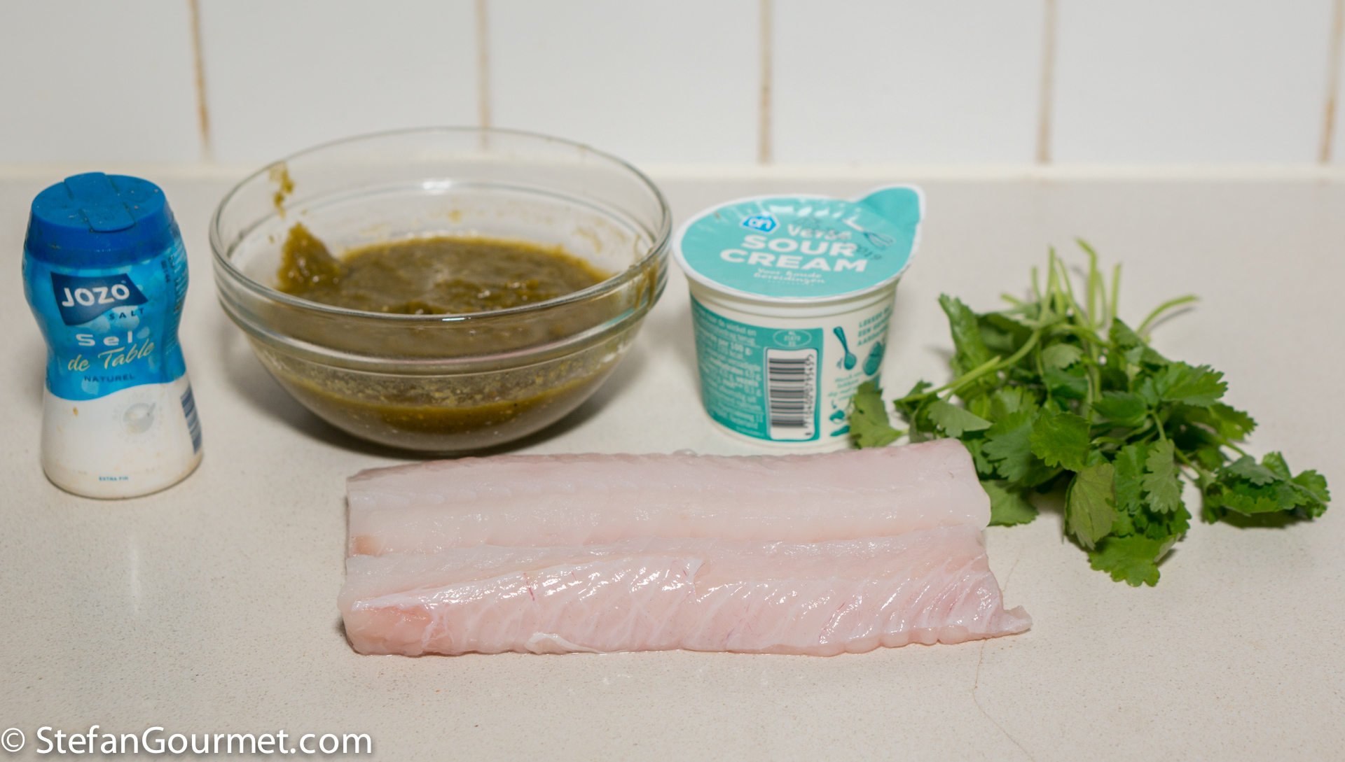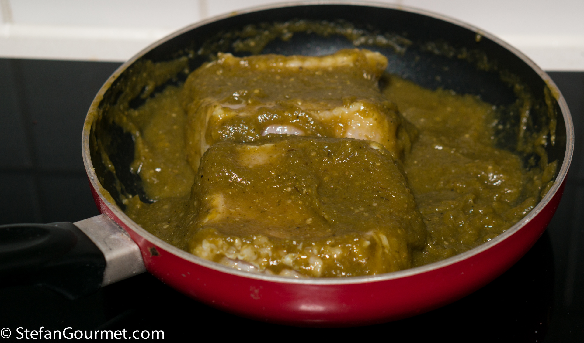 Another recipe with Mexican salsa verde: fish poached in salsa verde, and then served with the salsa and Mexican crema. This is quick and easy if you have already made the salsa verde. It is important not to overcook the fish and I provide an easy technique to accomplish just that: moist tender fish that is not overcooked. With the delicious salsa verde, this is very tasty.