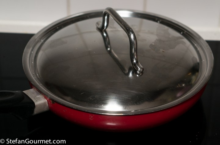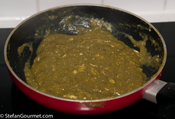 This method works even better if the amount of sauce is at least twice that of the fish. In such a case you can turn off the heat completely and use only the residual heat of the sauce to cook the fish. In this case there is not enough salsa for that, so very low heat is needed. But it definitely should not boil. We are aiming for a core temperature around 50C/122F of the fish.