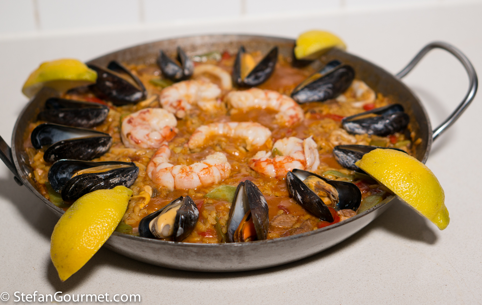 Paella is one of the best known dishes from Spain, although it is really from the Spanish city of Valencia on the Mediterranean coast. The name “paella” simply means “pan” in Valencian, although a paella pan is called a “paellera” in Spanish. There are many versions of paella, some more authentic than others, which is why Valencians think those other dishes should be called “arroz con cosas” (rice with stuff). The main versions are Paella Valenciana (meat paella with chicken, rabbit, and snails), Paella de Mariscos (seafood paella with shrimp, mussels, squid, scampi, and fish), Paella de Verduras (vegetable paella with runner beans, white beans, and artichokes), and Paella Mixta (mixed paella with meat, seafood, and vegetables).