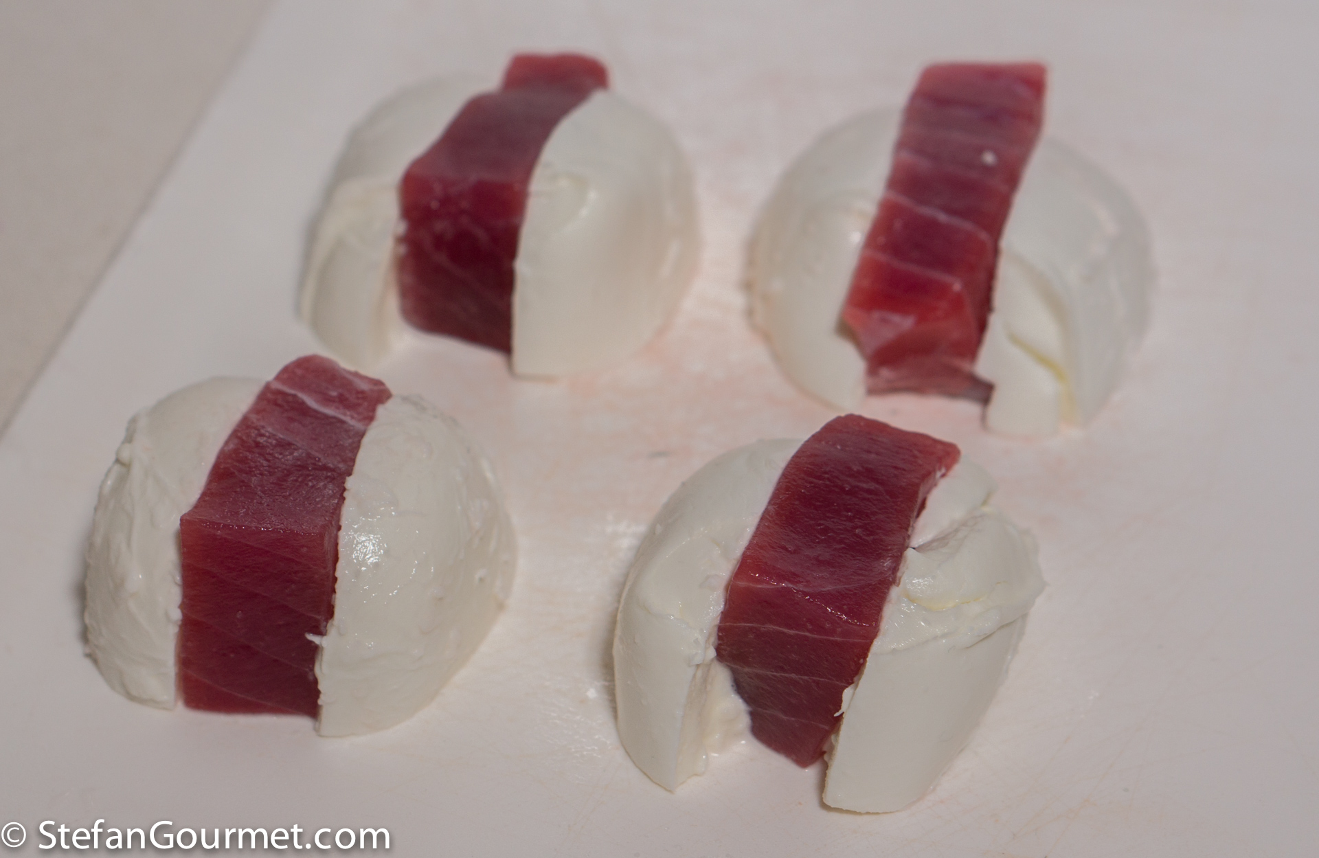 Prepare more or less round shapes with mozzarella mostly on the outside and tuna mostly on the inside, as we would like to melt the mozzarella without really cooking the tuna. You could also make an incision in the mozzarella and insert the tuna into that.