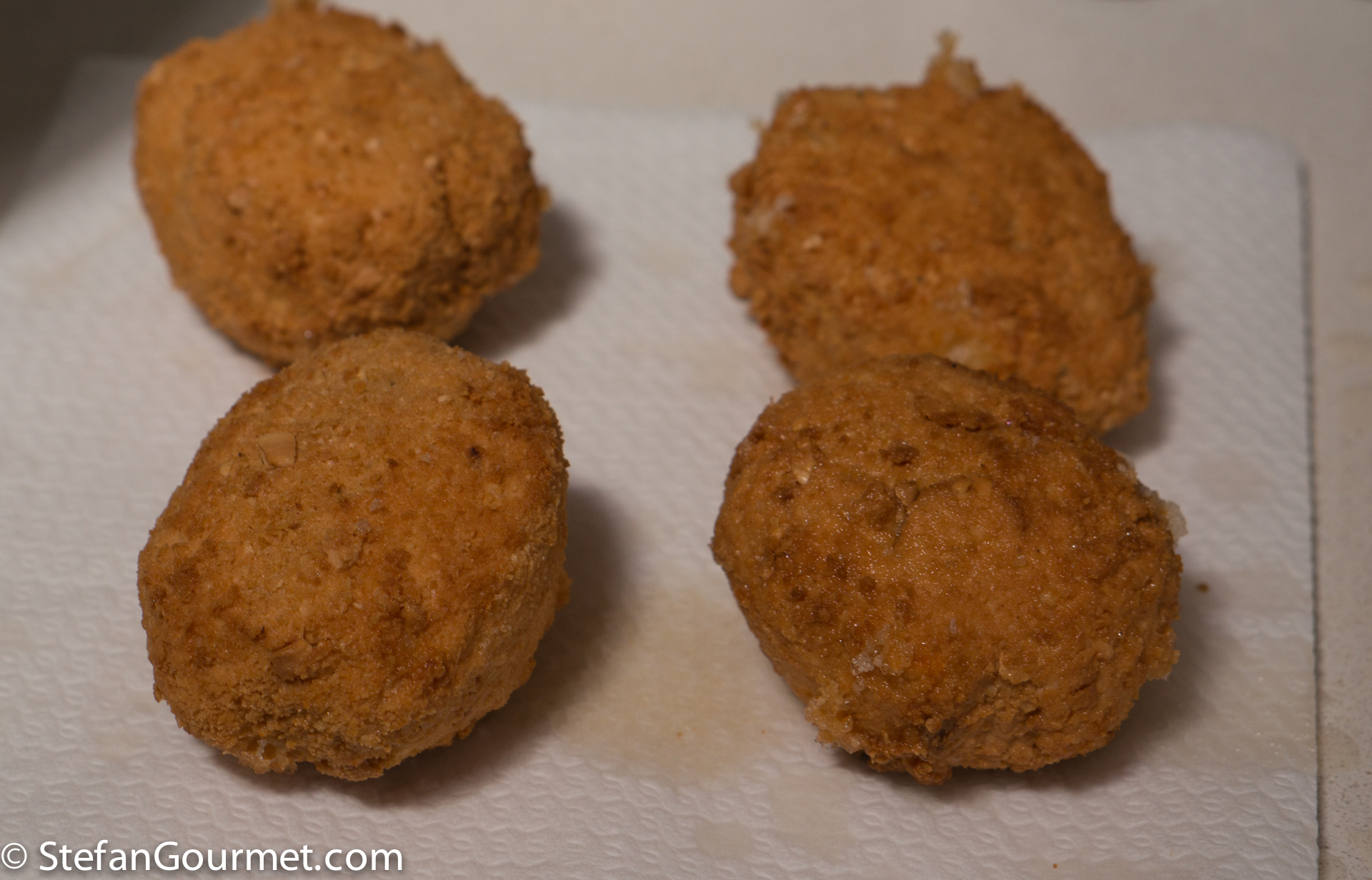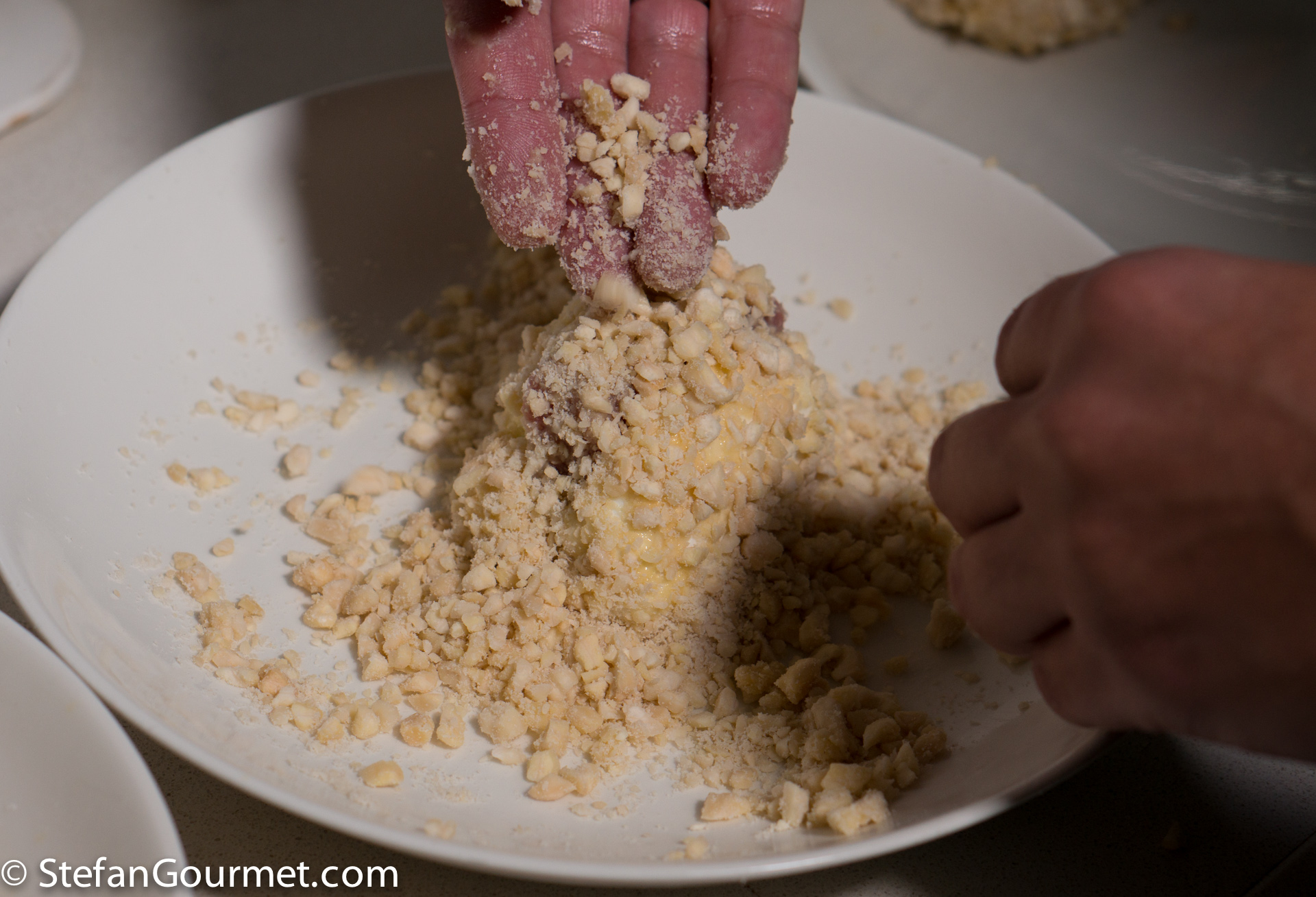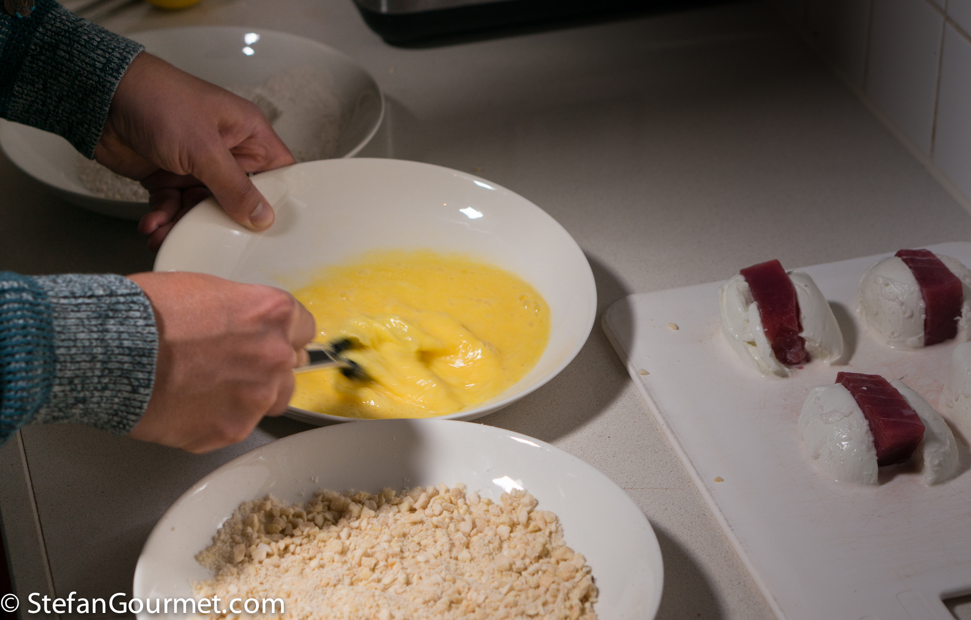 This appetizer was inspired by something we had at Taverna Estia** near Naples in Italy. Deep fried mozzarella is a common appetizer, but here it is enriched in two ways. First, by including tuna in the filling. Second, by using almonds for the crust. (At Estia a mixture of almonds and pistachios was used, and it was enriched even more by serving it with a Japanese ponzu sauce.) It is a bit finicky to put the breading on these. The combination of flavors and texture is very nice. Here’s what I did…