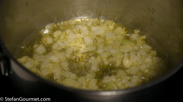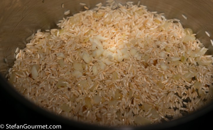 Heat the lard or oil in a pot and add the onion. (You may also start with the rice if you really want to brown it.)