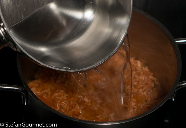 Add the preheated stock or water, in which you have dissolved 1/2 teaspoon of salt. (Add only salt to the stock if it was unsalted.)