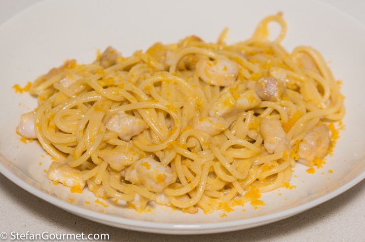 Spaghetti alla Carbonara di Mare is a seafood version of the famous dish, made with bottarga (cured fish eggs), pieces of swordfish and calamari.