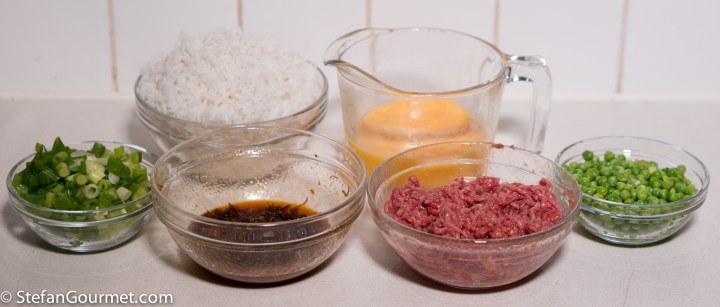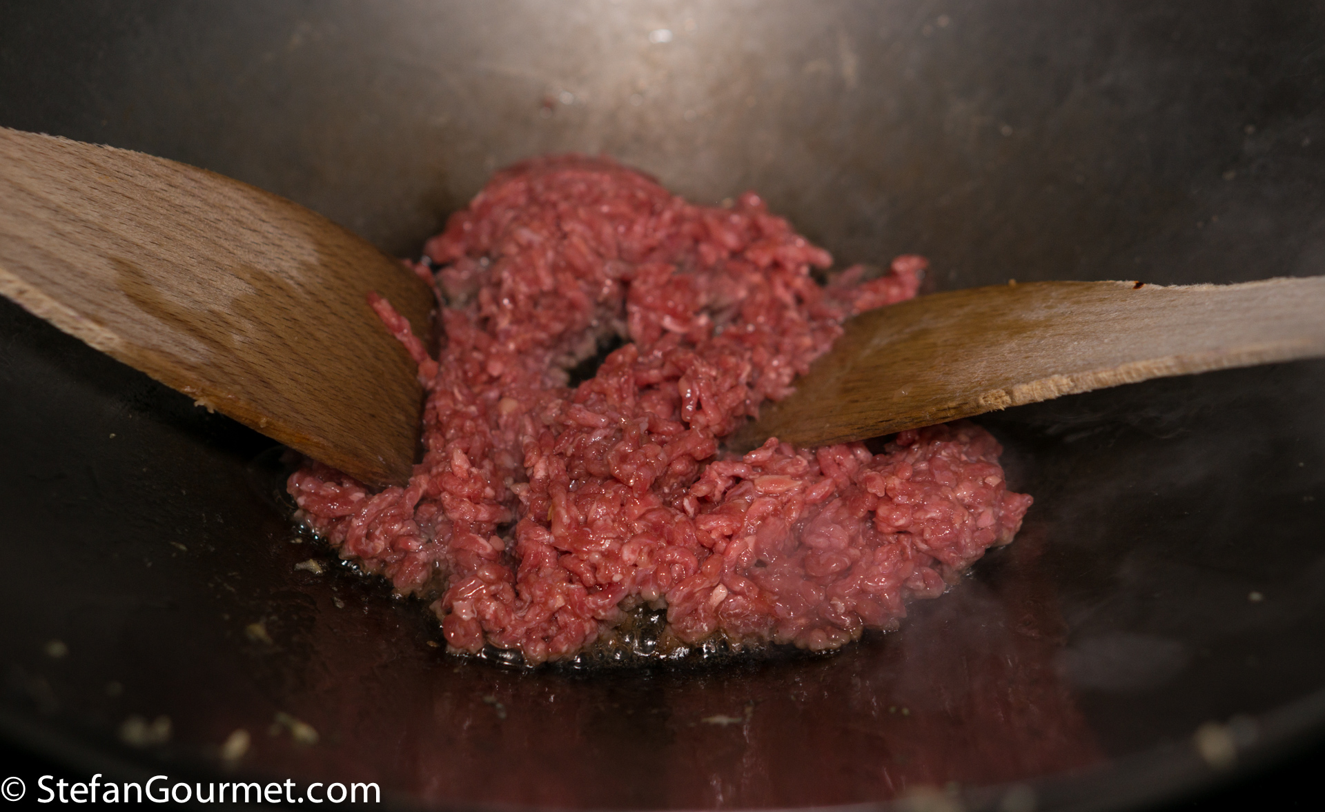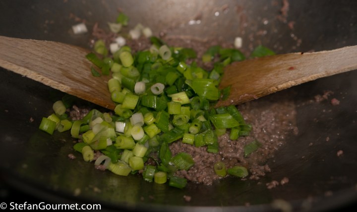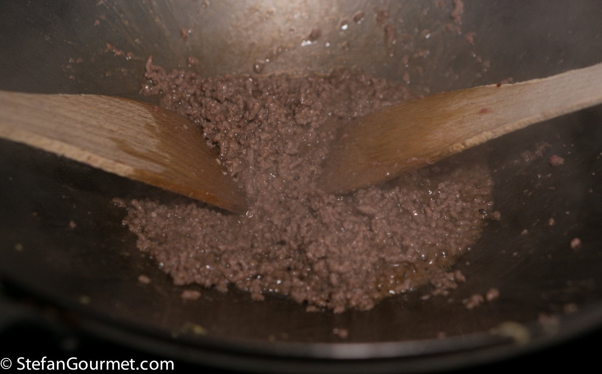 200 grams (7 oz) ground beef, mixed with 2 Tbsp oyster sauce and 2 tsp sesame oil, allowed to marinate for 10 minutes