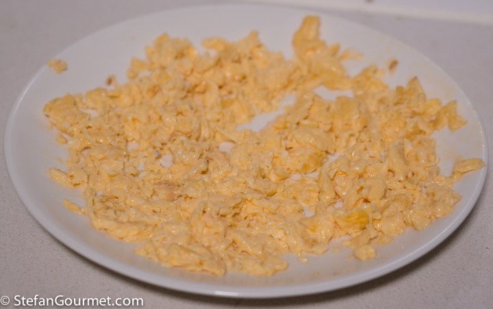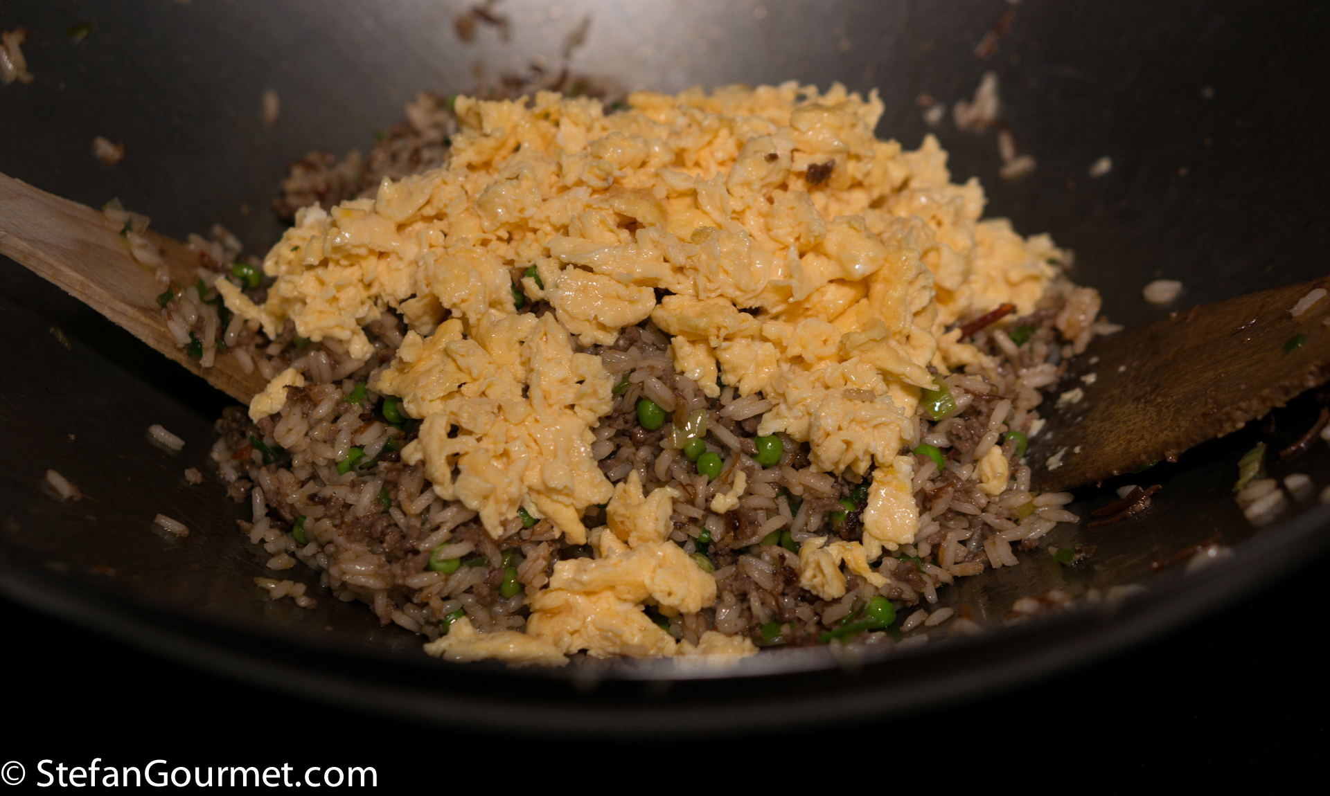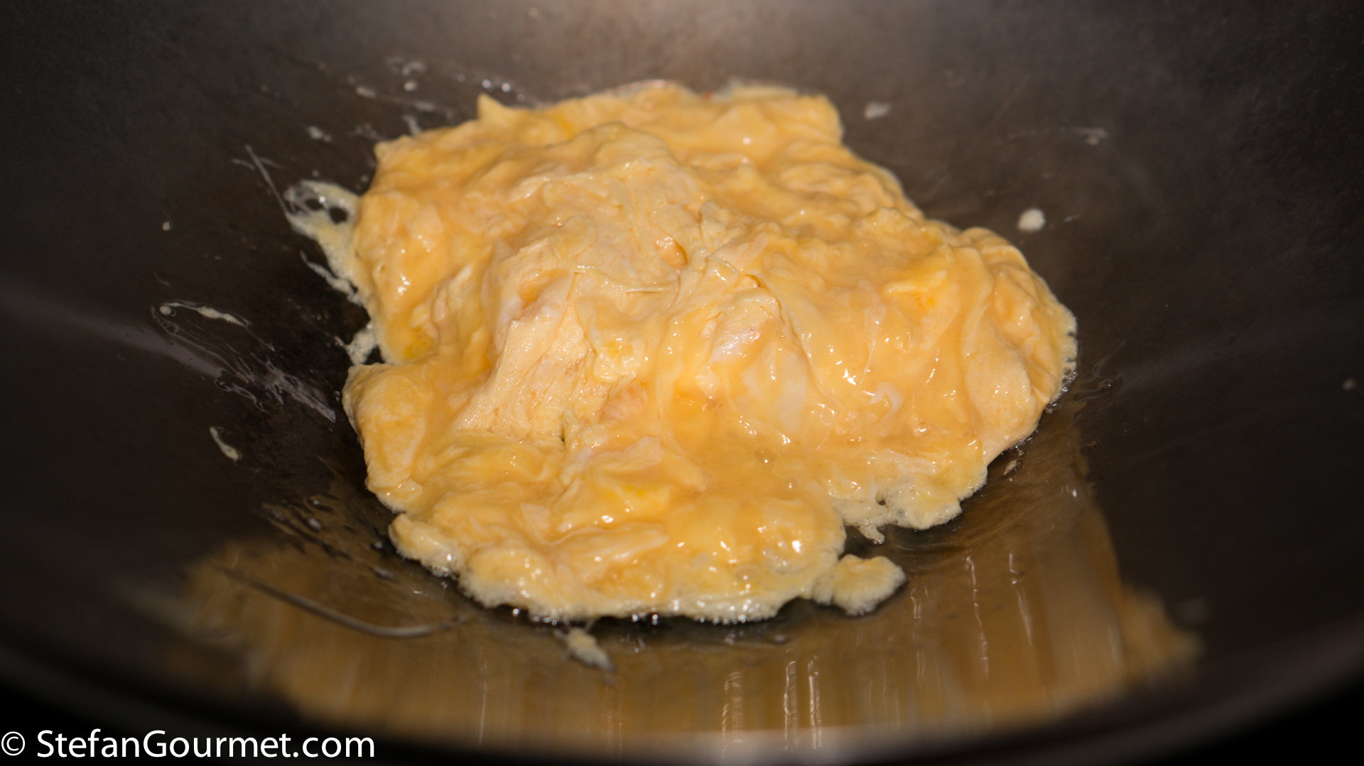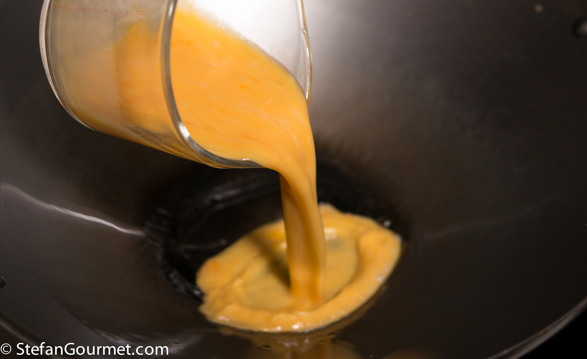 Heat a tablespoon of oil in a wok over high heat. When the oil stars to smoke, add the beaten eggs.