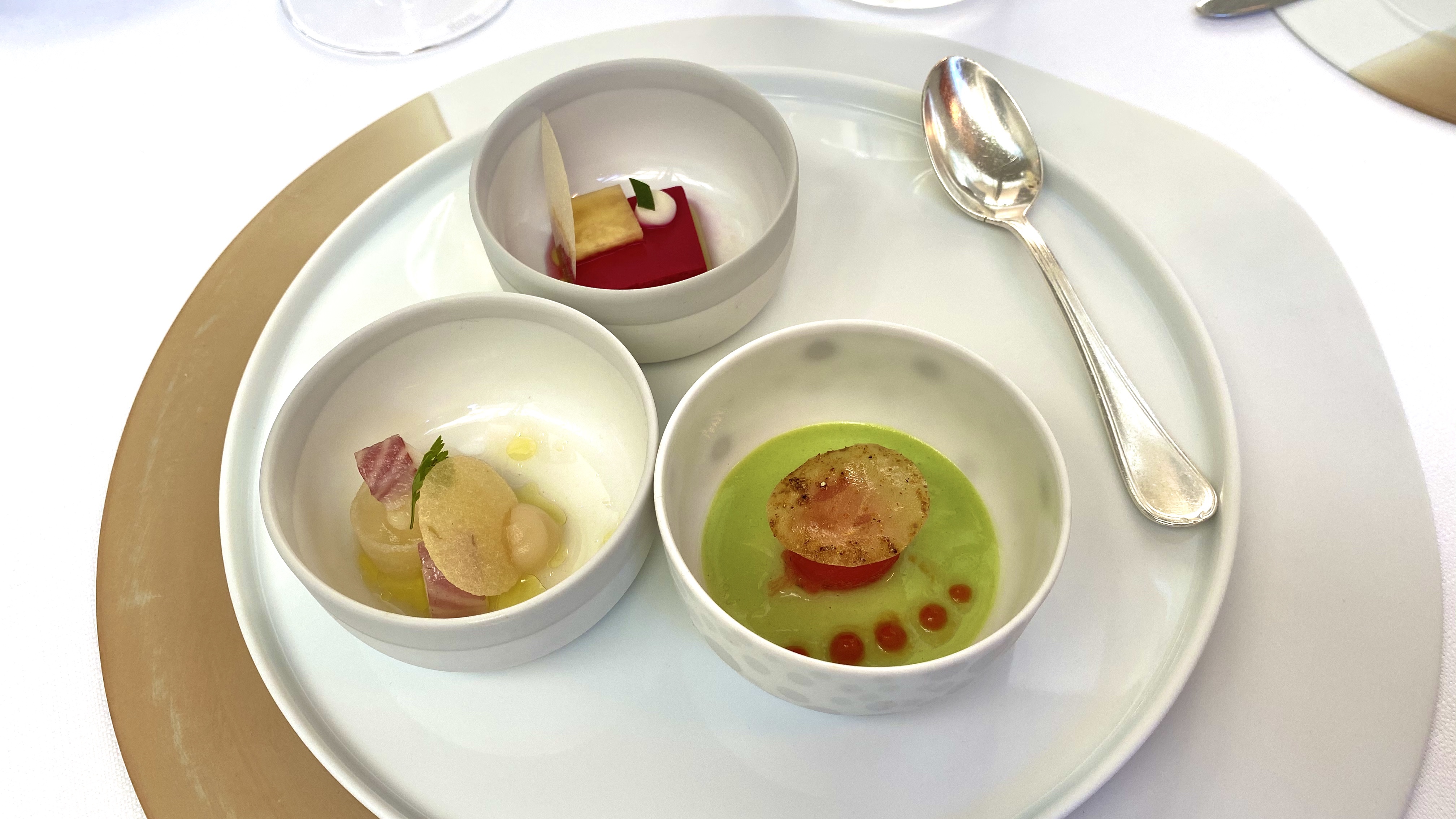 The package included an 8-course degustation menu (225 euros), with wine pairing (92 euros). We were disappointed the menu did not include Oosterschelde lobster, as they are still in season. The menu started with savoureux apéritifs: beetroot with roses, pineapple and buttermilk; watermelon infused with lime, cardamom, and cream of peas; smoked Oosterschelde eel with daikon and miso. Although most people have champagne as an apéritif (as did we), only the eel went well with the champagne. The champagne was a Grand Cru blanc de blancs (i.e. Chardonnay only) (24 euros per glass).