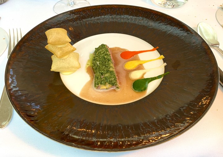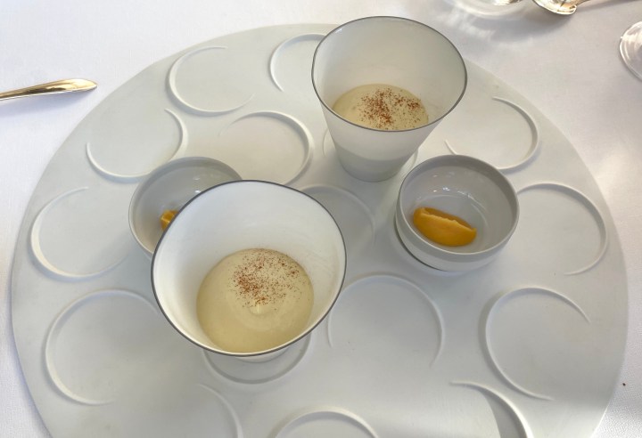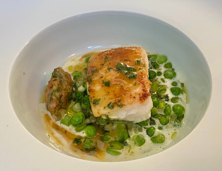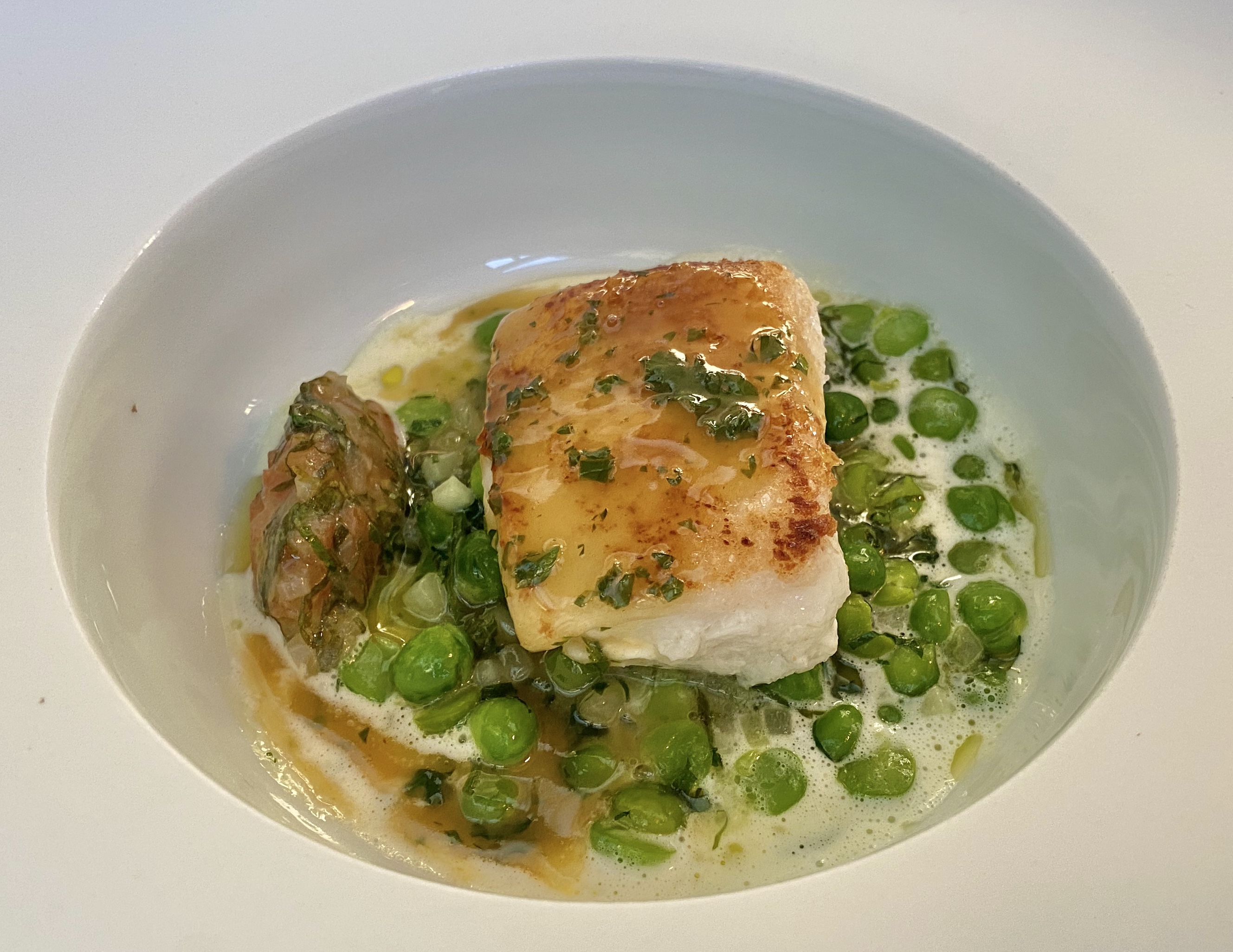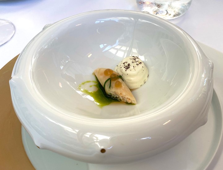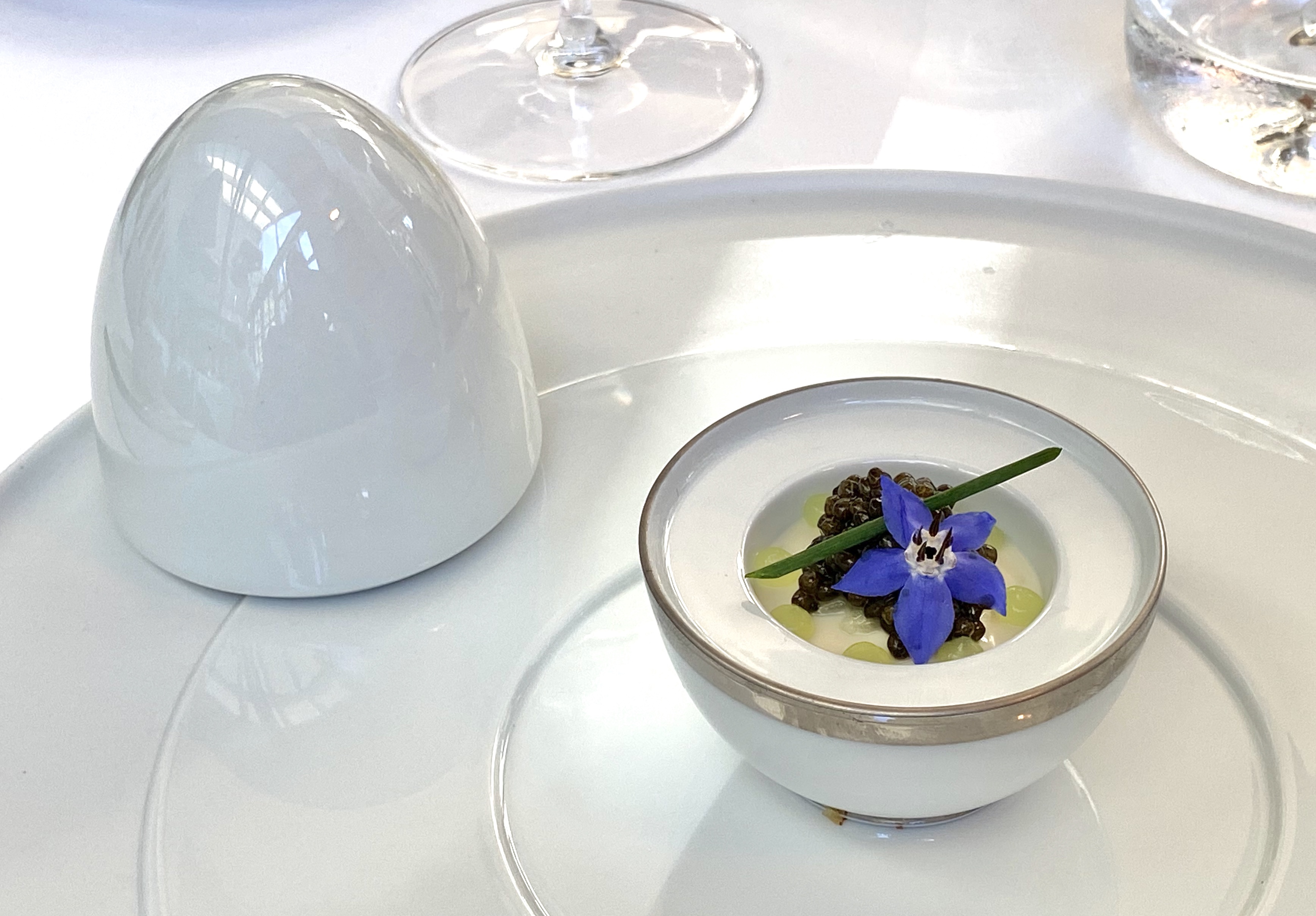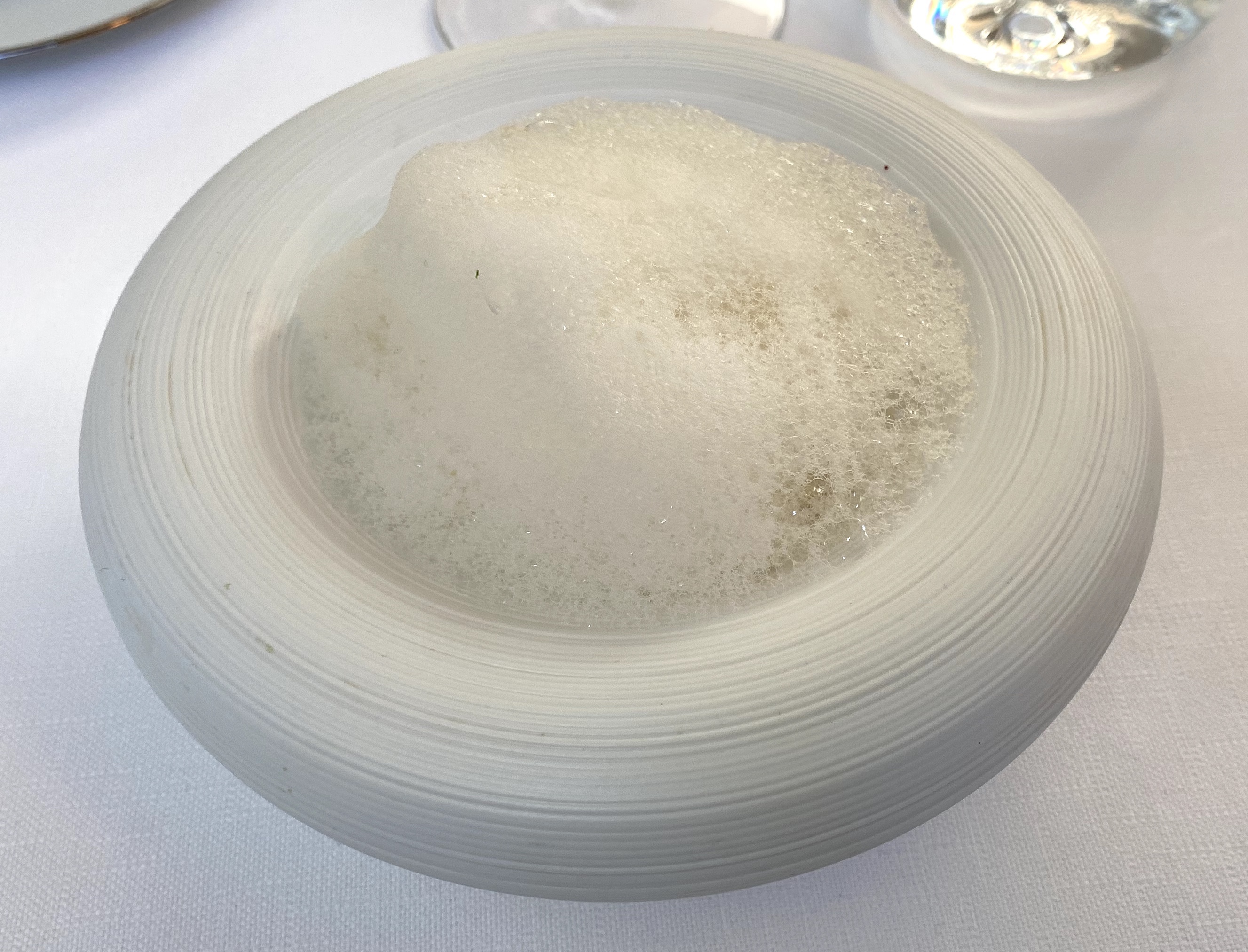We had mentioned to the sommelier that we would like to upgrade the wine pairing to a nice white Burgundy, if possible. Many restaurants offer premium wines by the glass using the Coravin system. He responded that he refuses to work with Coravin because he had had one bad experience with it, where the last glass from a bottle was oxidized. We indicated that sounded like not using the Coravin system properly (because you have to make sure the needle is filled with argon rather than oxygen before you push it through the cork). Since we could only order a nice white Burgundy by the whole bottle, we decided to stick with the wine pairing. This was a Chenin Blanc from Swartland in South Africa. According to the sommelier this was one of his favorite wines, because he really likes the wine maker as a person. The wine was okay with the dish, but not great.