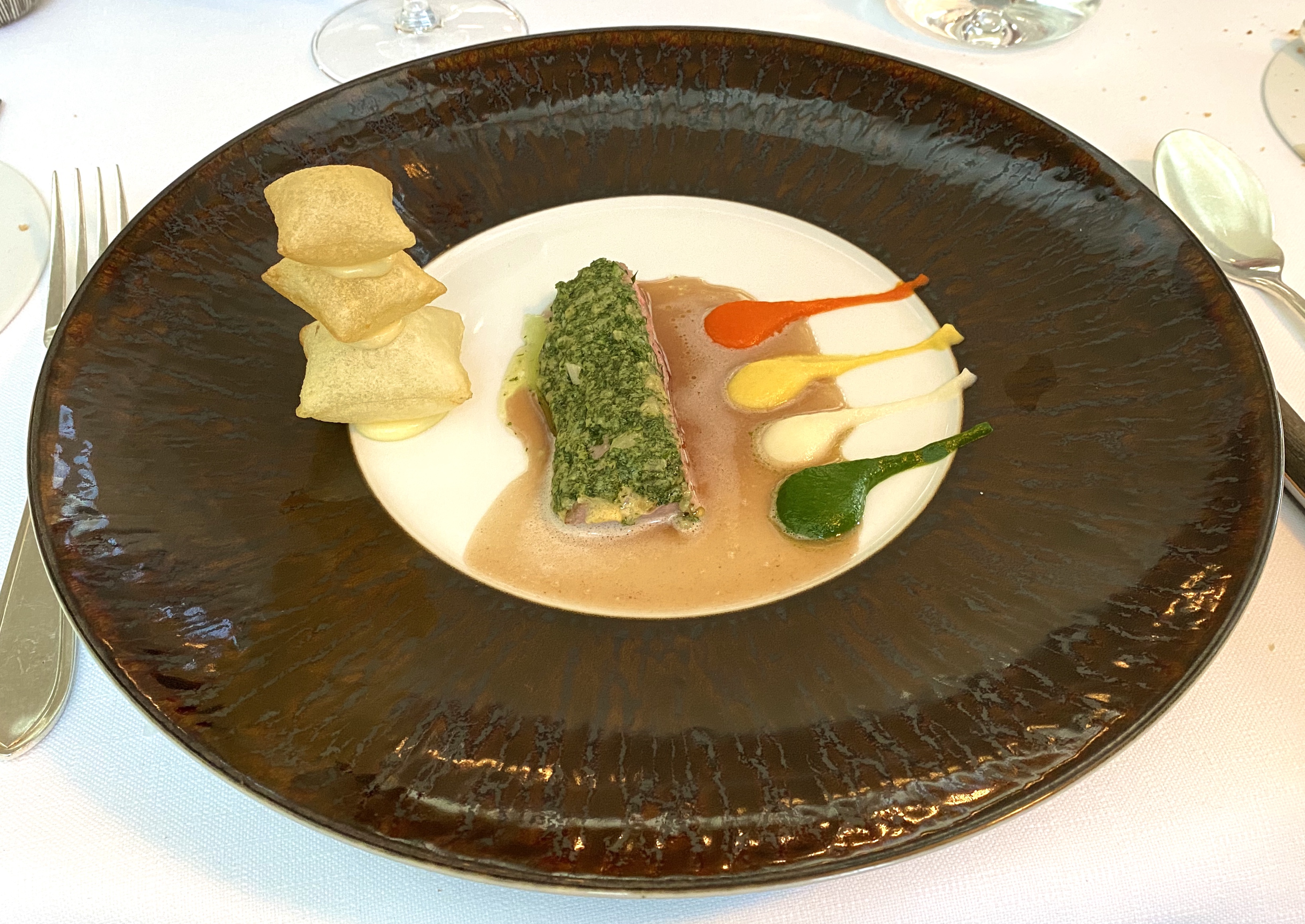 First course of the menu: brandade of turbot with grapes and caviar. The brandade is an emulsion, very much like mayonnaise, and included raw garlic. It worked nicely with the caviar. It was paired with a Roussette de Savoie, a wine you don’t see often from the Jura in France, made from the grape variety Altesse. This was an aromatic wine that worked well with the dish; it could handle the unctuous brandade as well as the grapes. 9/10