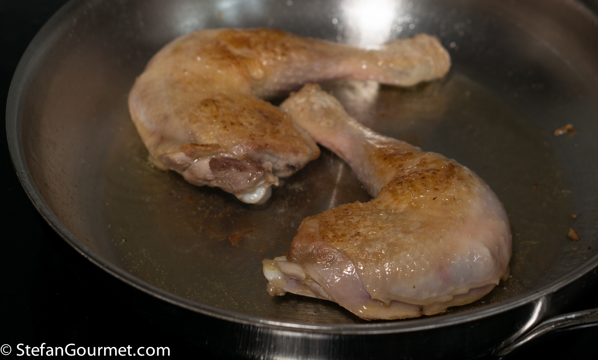 Heat two tablespoons of olive oil in a frying pan and brown the chicken over medium-high heat until golden brown on both sides.