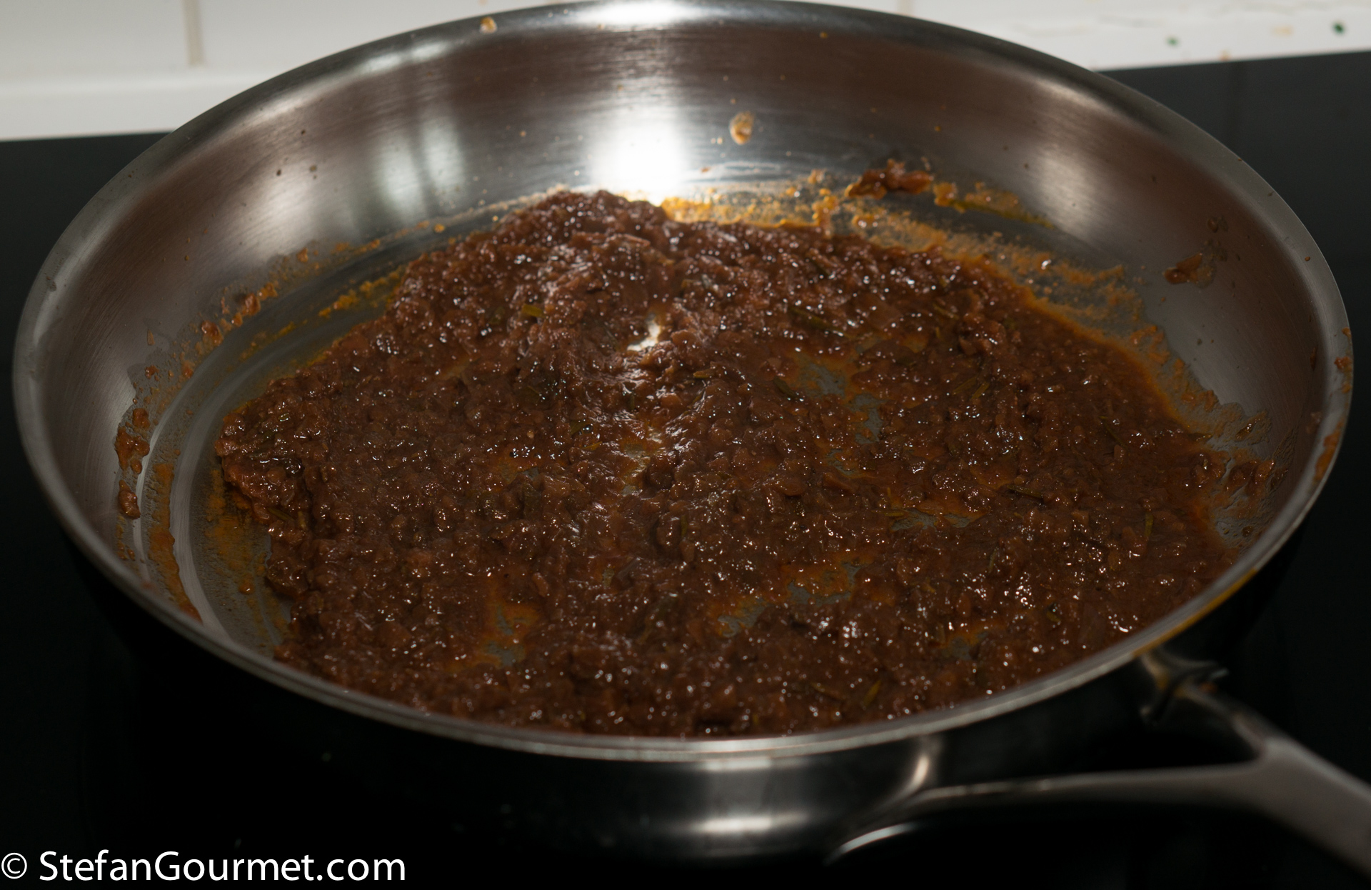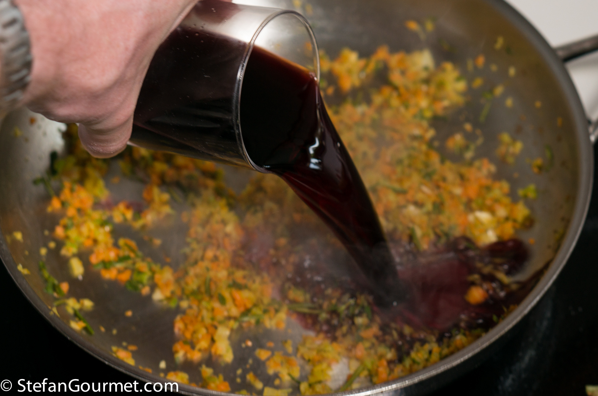 Deglaze the pan with the red wine. Stir over medium-high heat until the wine has reduced by half.