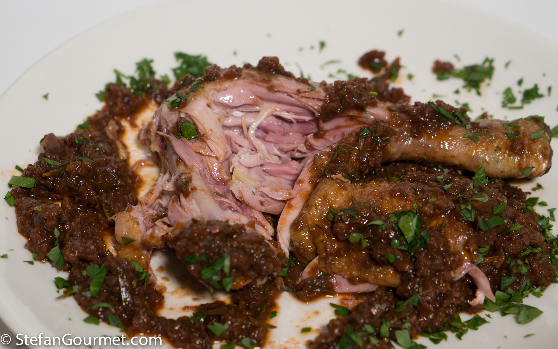 Cooking this dish sous vide has as the advantage that the chicken will be super tender and moist. Leg meat of chicken is dark meat, so it will look pink. If you think this is undercooked, perhaps you should stick to the classic recipe, or increase the sous vide cooking temperature. However, if you do do, you may just as well prepare the classic version. This chicken was cooked for 24 hours at 60C/140F. 24 hours sounds like a long time, but it is actually quite convenient as you could prepare it the day before, drop it in the sous vide and just forget about it for the next 24 hours or so. It doesn’t really matter if you cook it for 20 hours or 24 hours or 28 hours. When it is time to serve, you can basically serve it straight from the bag. Of course this tastes better if you use organic / free range chicken.