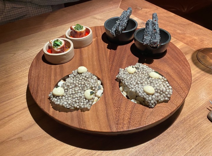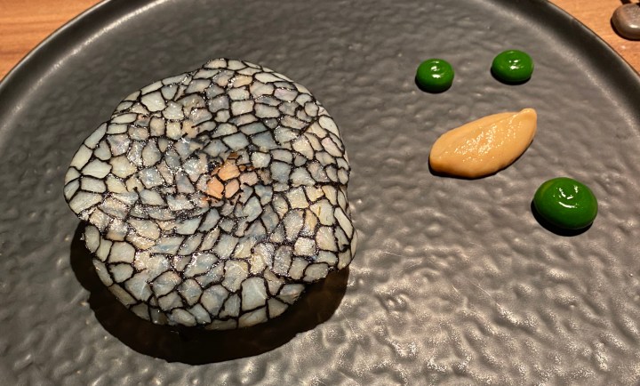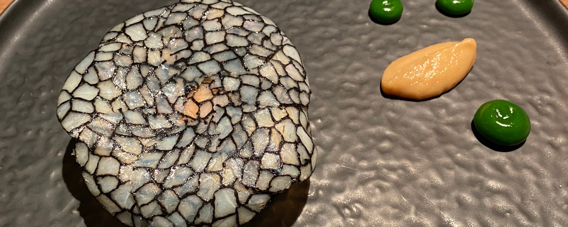The snacks were oyster crackers, octopus with romesco sauce, and bell pepper tempura made with a black batter. This was all very nice, although the wine had some trouble with the sauce that came with the bell pepper.
