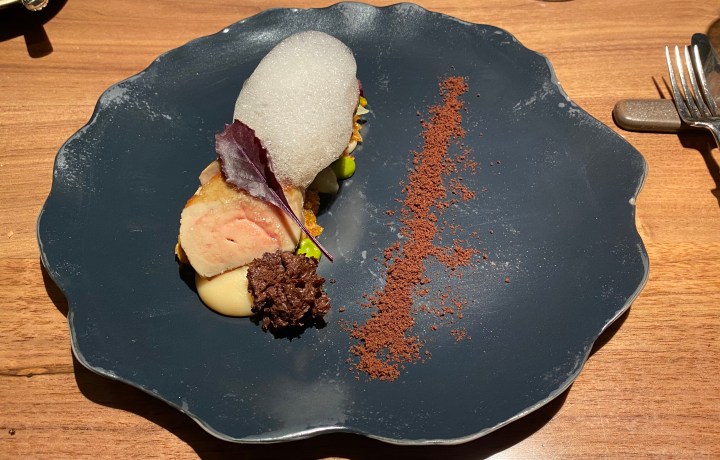 The wine worked very well with the next dish, seared foie gras with granola, beet root, fluffy sugarless chocolate cake, and coffee. This was a very generous portion of foie gras, that played more a role in the (unctuous) texture of the dish than as a distinct flavor. The whole combination became one new flavor. It was very nice and certainly 9/10, but for me it missed the wow factor that foie gras can have for me and would have taken it to 10/10.