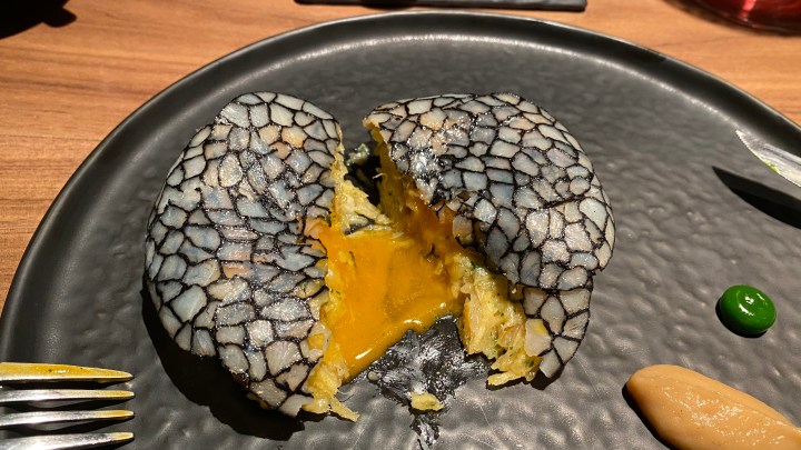 …and the soft egg yolk was inside. It was topped with carpaccio of bacalhau that was made to look like the typical cobblestone pavements of Lisbon. The dish worked well with the wine and was very tasty, although apart from the presentation it was quite rustic. 9/10