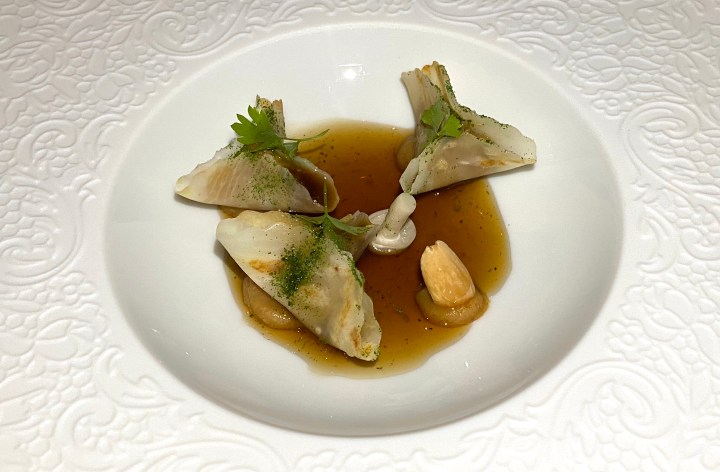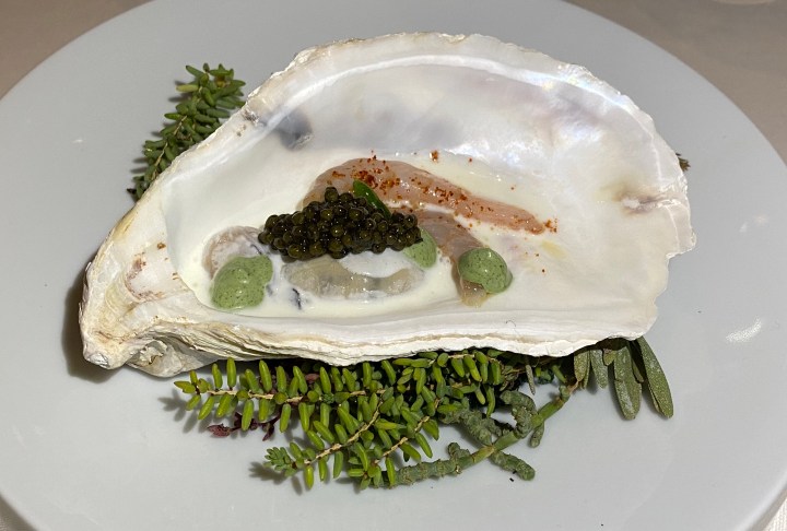 The first course was oyster with raw shrimp, caviar, and plankton. It was an excellent pairing with the wine, especially with the oyster.