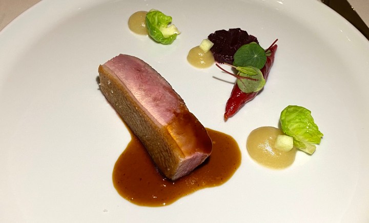 It was a good pairing for the duck breast, served with sauerkraut of purple cabbage, beetroot ‘schupfnudeln’, and apple sauce (!). The beetroot dumpling didn’t taste of beetroot and the skin on the duck wasn’t crispy, so this dish was a bit boring.
