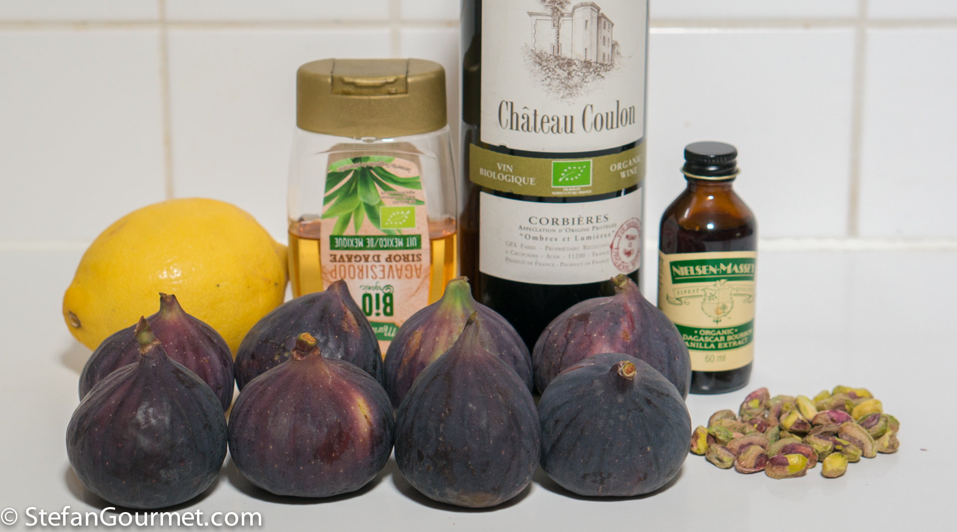 Ingredients for version with red wine, lemon, vanilla, and pistachios