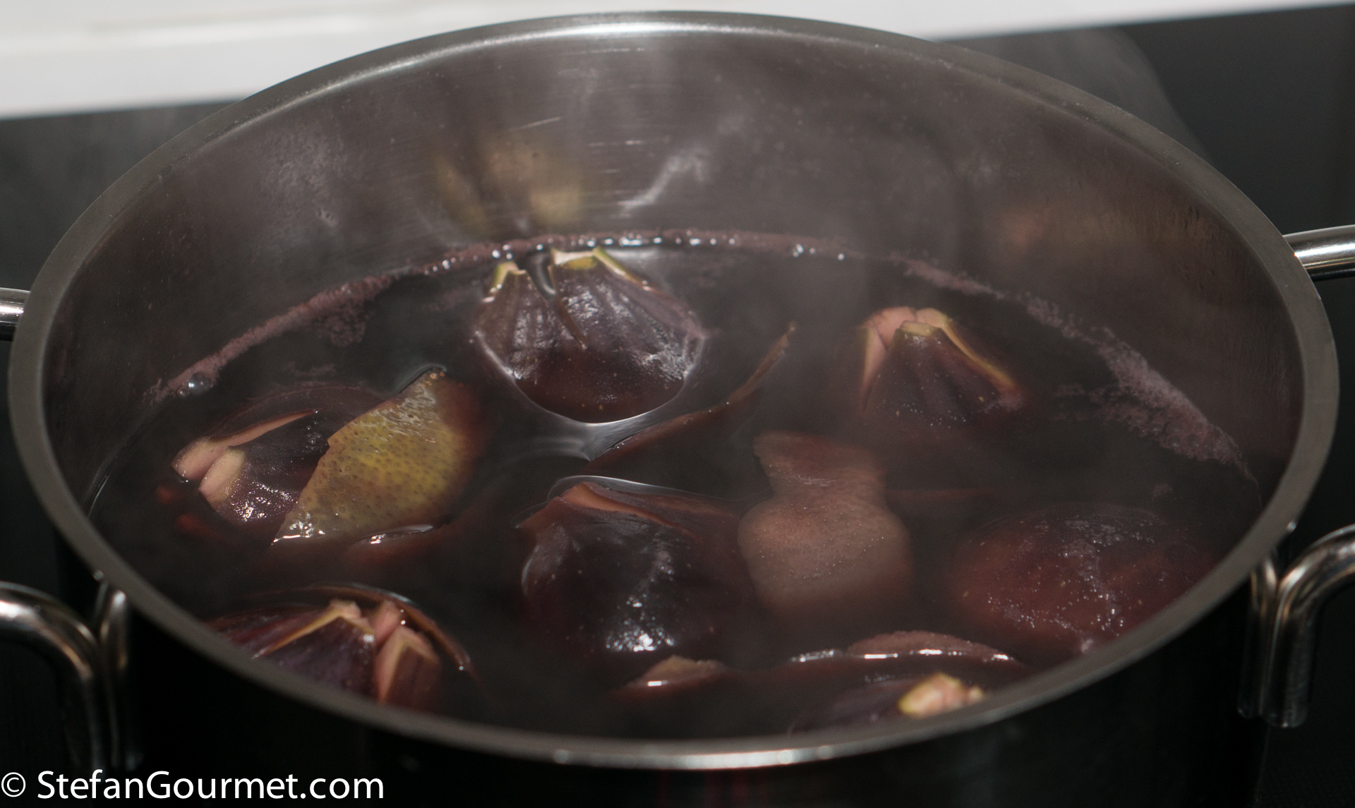 Turn off the heat as soon as it boils, then allow the figs to cool off in the hot wine. This will poach the figs.