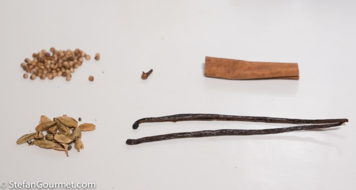 Ingredients for version with port, coriander seed, cardemom, clove, cinnamon, and vanilla
