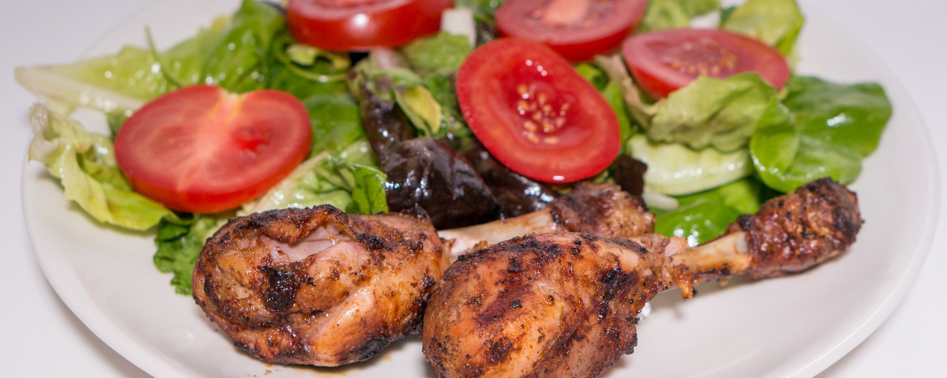 When the chicken is cooked through, serve it with a salad of lettuce, tomatoes, and cilantro, dressed with salt and extra virgin olive oil.