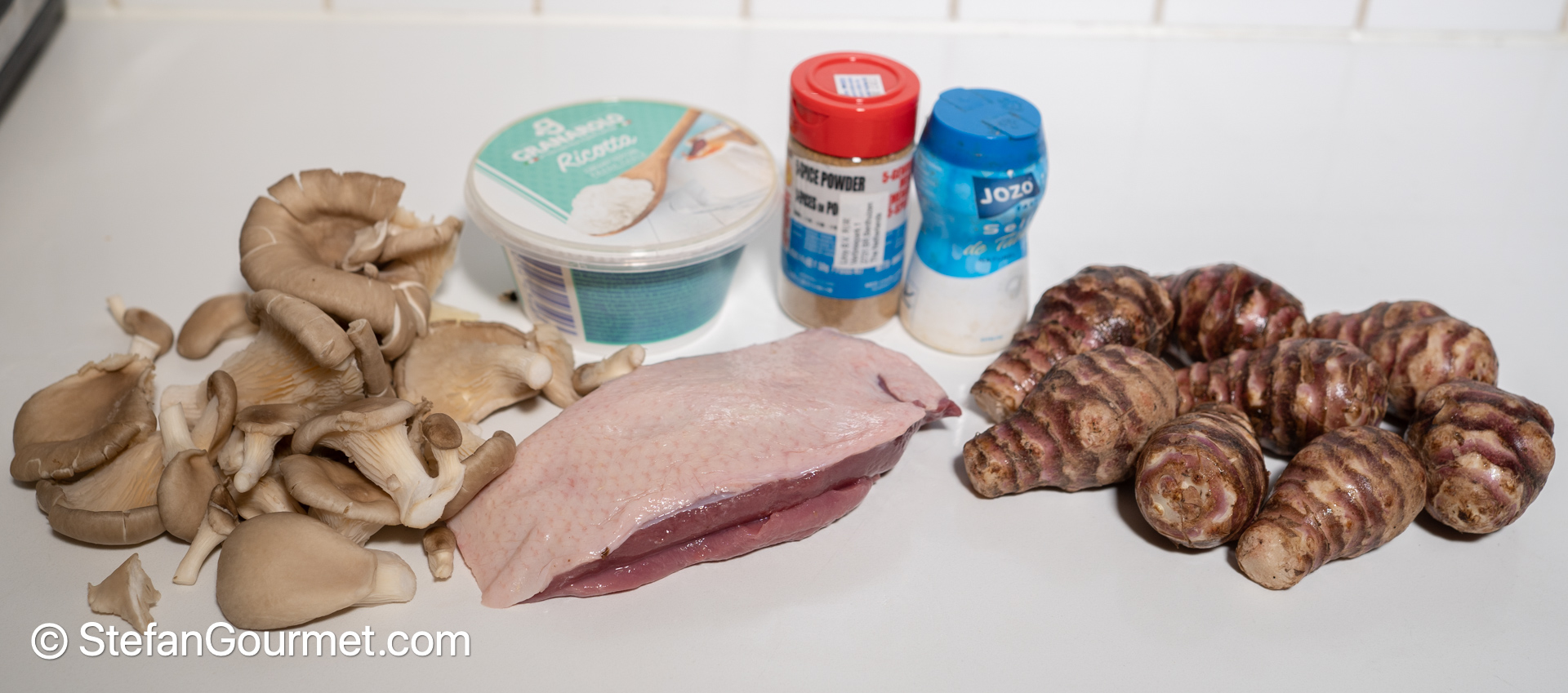 I enjoy cooking, but it is also a great pleasure if someone cooks for me for a change. I appreciate it all the more because it can be nerve-wracking or at least intimidating to cook for a more experienced cook. My friend Anja prepared something similar to this, and I really liked the flavor combination of creamy sunchoke puree, earthy mushrooms, crispy duck crackling, tender and juicy duck breast, and the aroma of five spice. Anja made the five spice powder from scratch, but I was lazy and used store-bought. I cooked the sunchokes and duck sous vide, and replaced the mascarpone with ricotta as I had some leftover ricotta that needed to be used up (mascarpone will make it richer). I couldn’t find chanterelles, and so used oyster mushrooms instead. I did not add any fat, but used just the rendered fat from the duck to cook the mushrooms and sear the duck breast. It turned out very good, almost as good as Anja’s version.